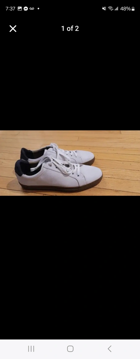 These sneakers are white leather with a navy blue trim. They have a rubber sole and lace up closure. They appear to be in good condition.