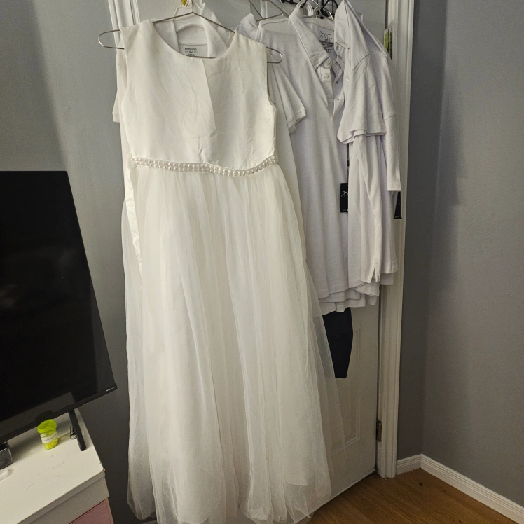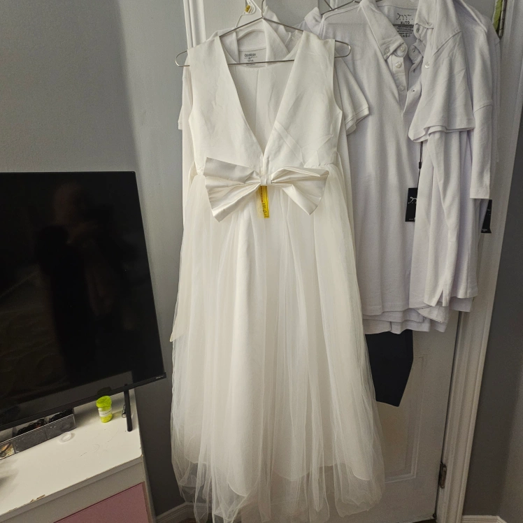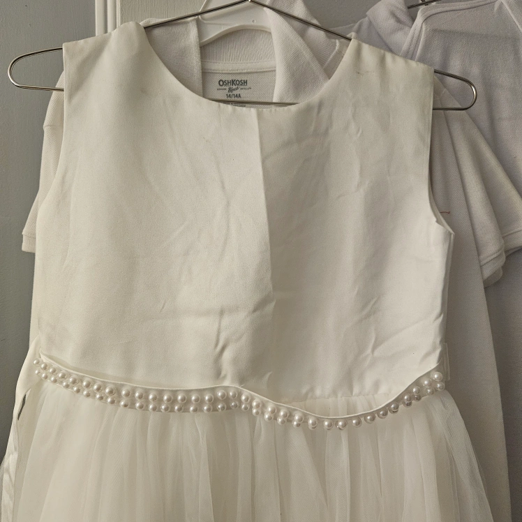 White tulle dress with a satin bow on the back, a satin bodice and a pearl trim.
