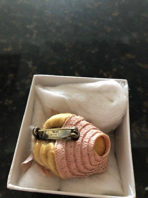 This is a vintage doll head brooch with blond hair and a pink hat and scarf. It is in its original box. It would make a great gift or addition to a doll collection. The pin is Italian sterling silver. Truly unique and gift-able. From a smoke and pet free home. Pickup only in the St. Lawrence market area of downtown Toronto. Cash only.