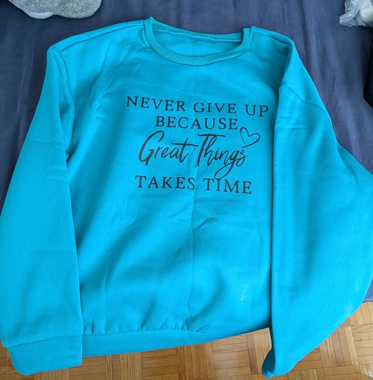 Teal long-sleeved crew neck sweatshirt with a black graphic. Never worn, was stored in the wardrobe.
