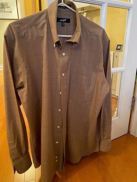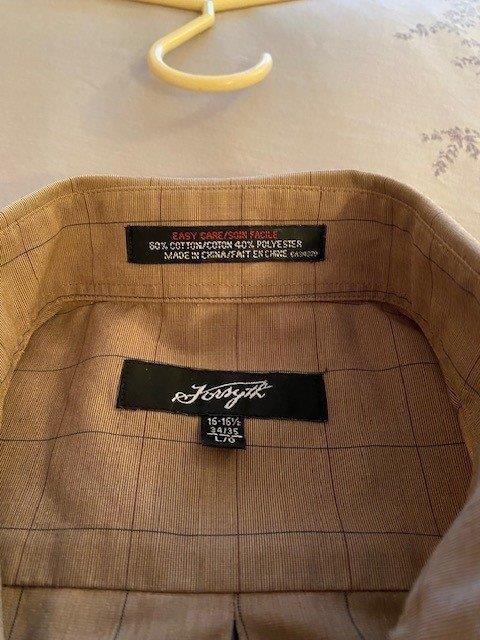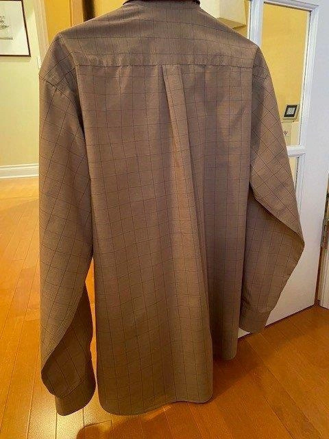 Long sleeve, button up, size 16-16 1/2, 34/35, brown plaid with black stripes. Button down collar and front upper pocket. Is is called’easy care’ fabric consisting 60% cotton and 40% polyester and includes extra buttons. Fresh laundered and pressed and from a smoke and pet free home. Pickup only in the St.Lawrence market area of downtown Toronto. Cash only.