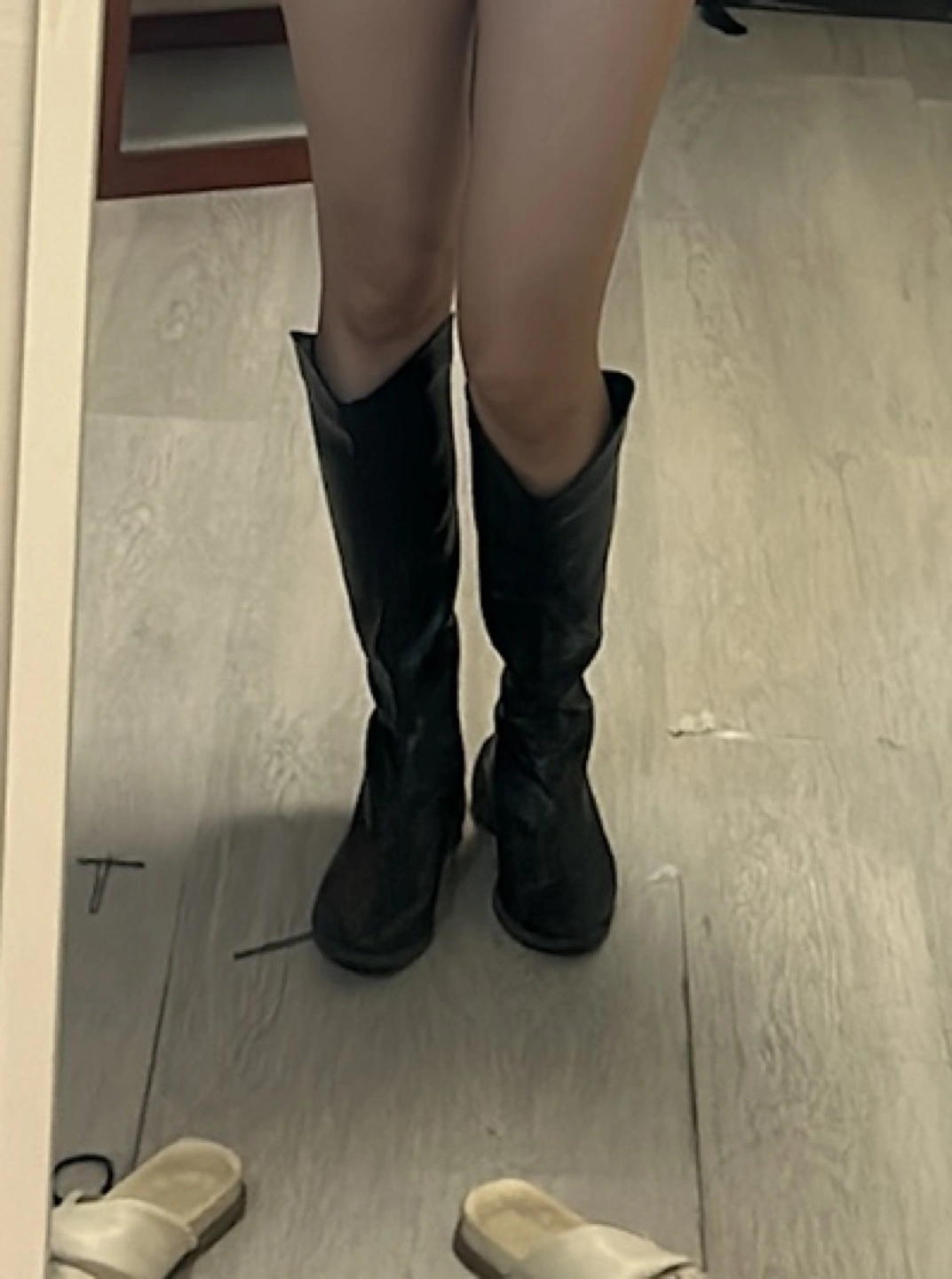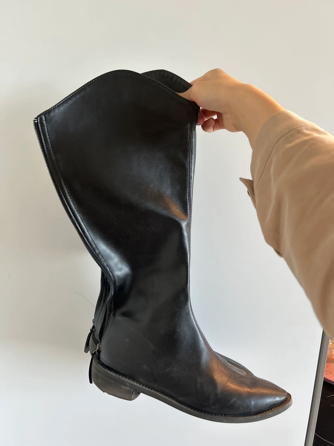 These are a great pair of stylish black knee-high boots. They have a zip up the back and a pointed toe. They would be perfect for dressing up an outfit.