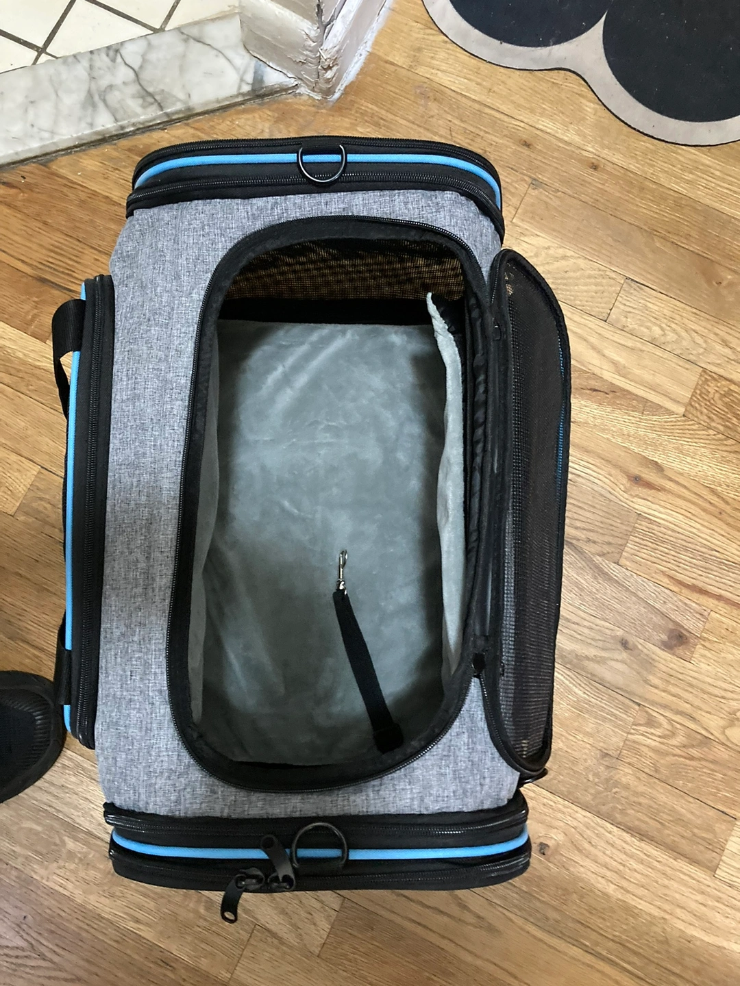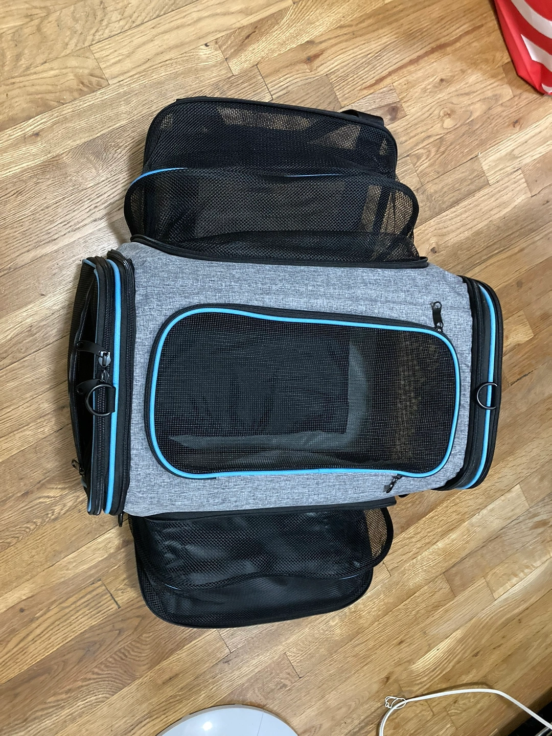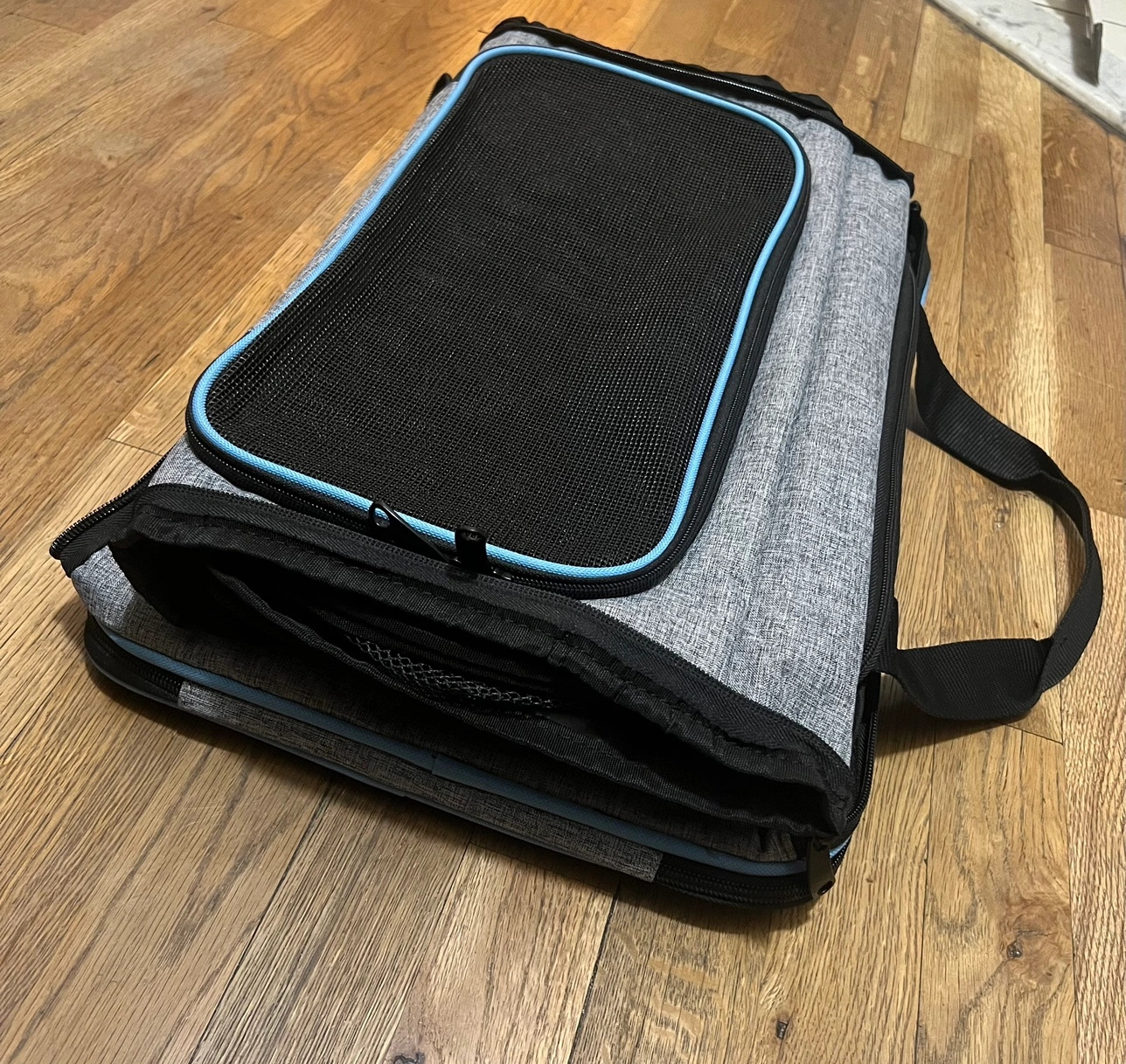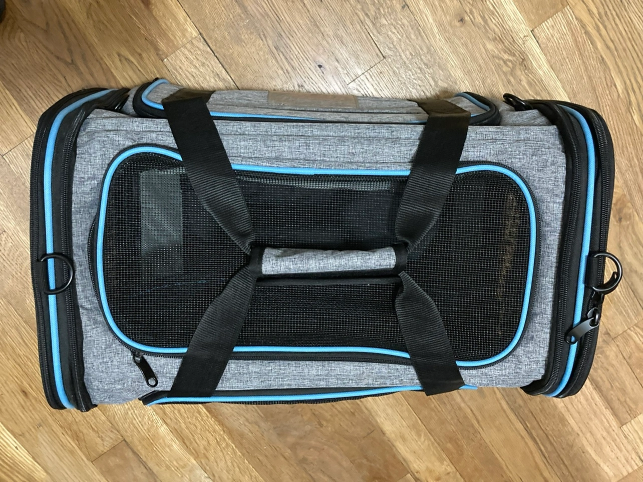 Gray pet carrier with blue accents and mesh windows. Has adjustable straps and pockets. Folds flat for easy storage. Excellent condition.