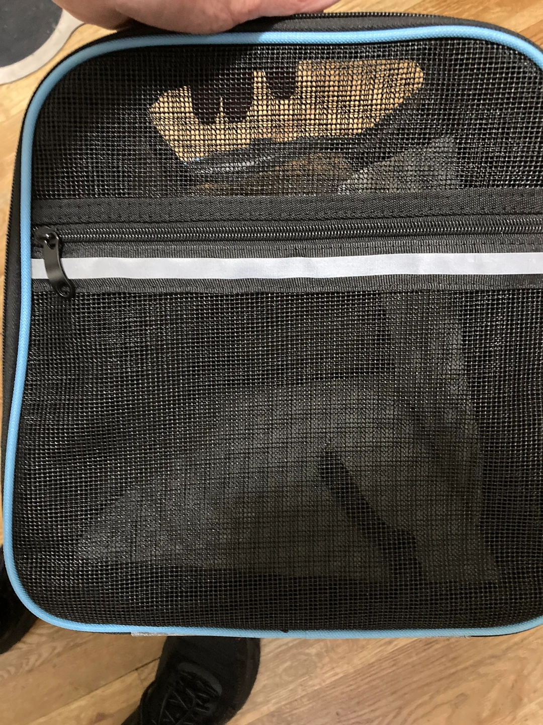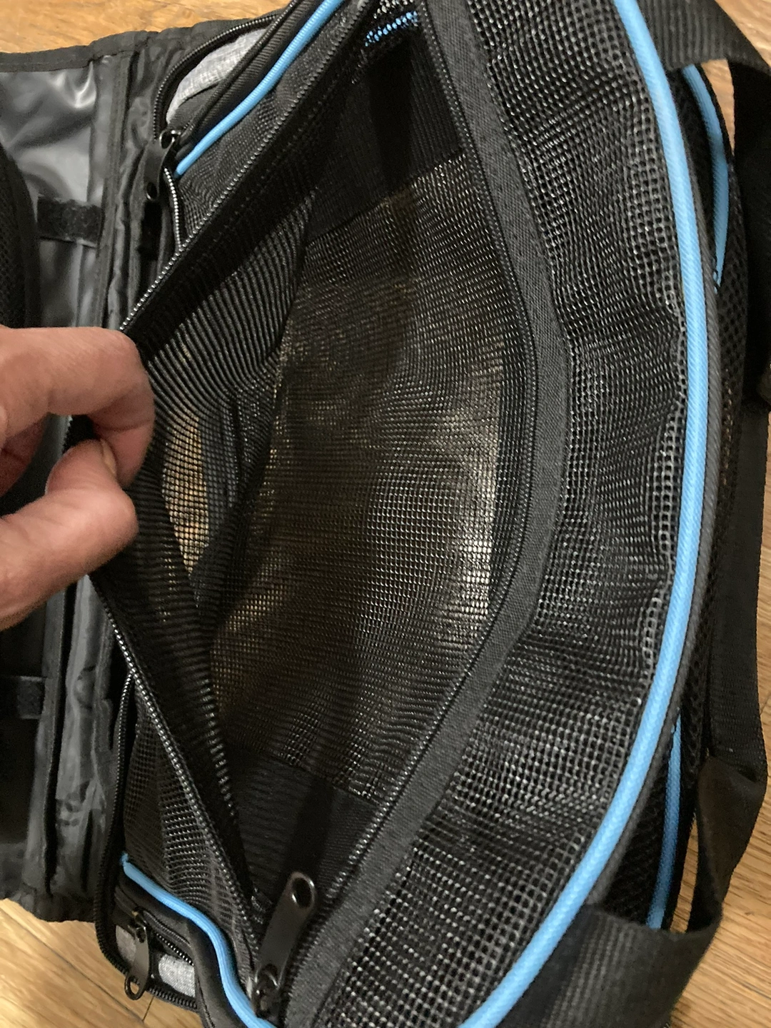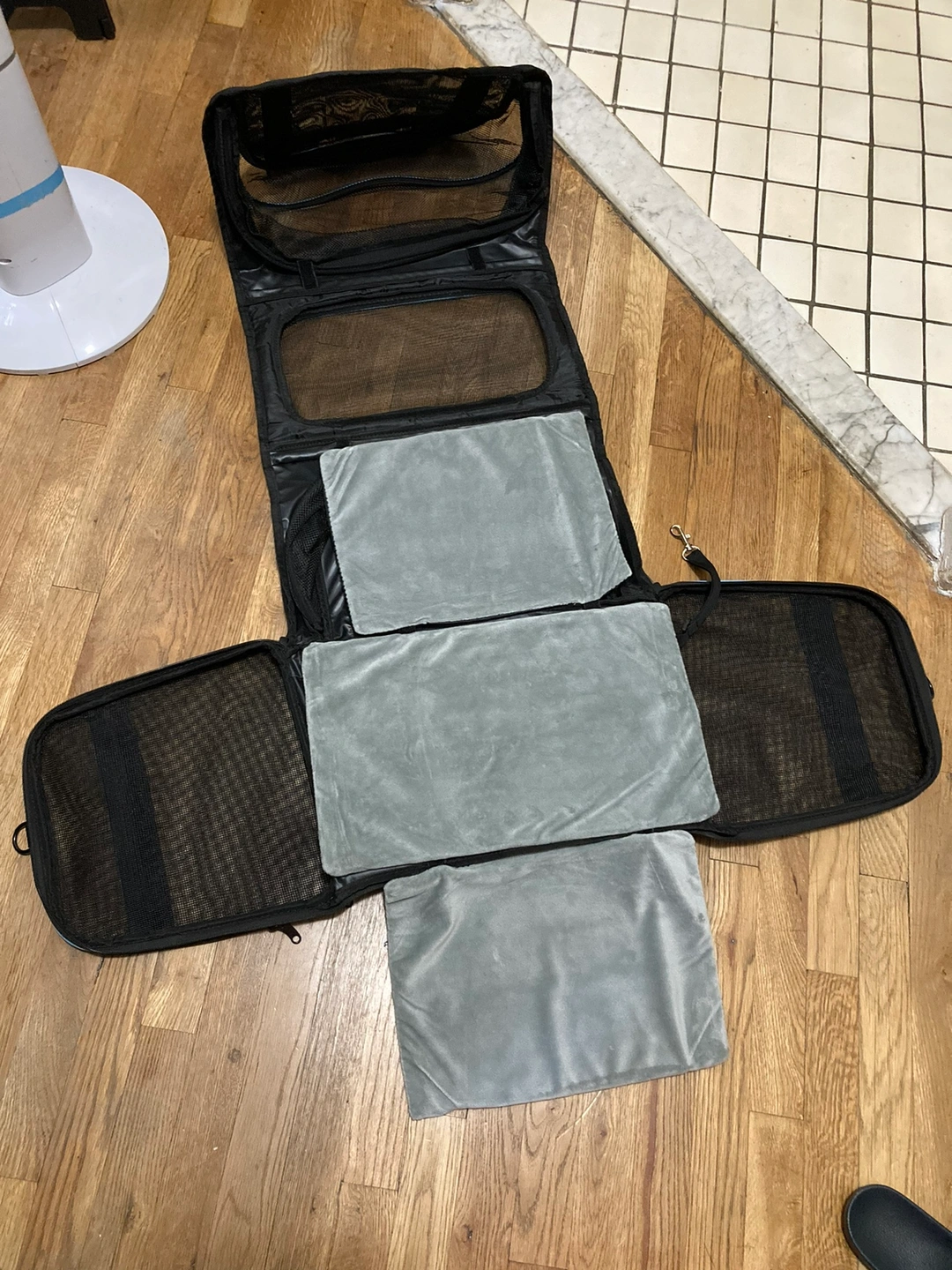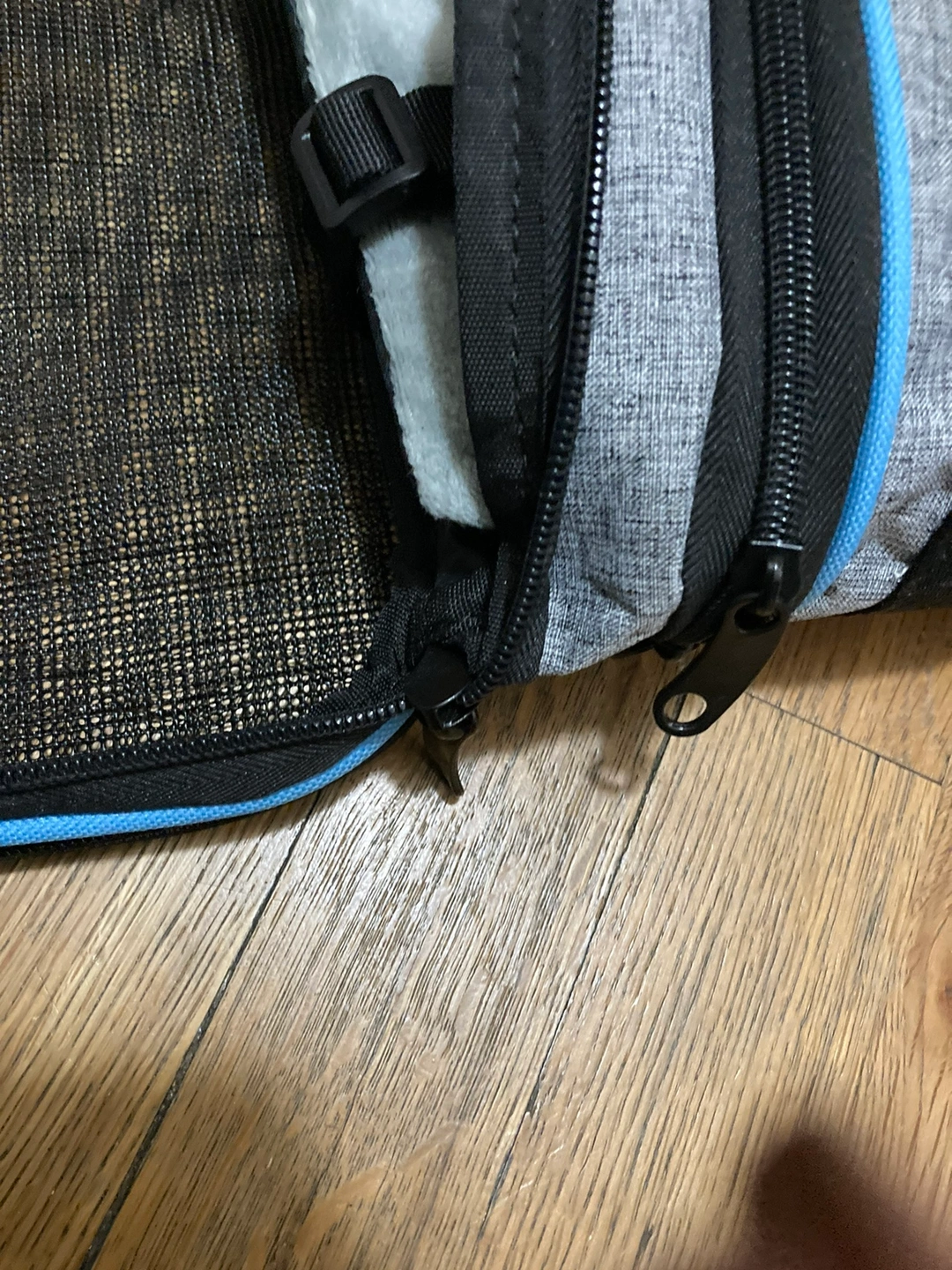 Gray pet carrier with blue accents and mesh windows. Has adjustable straps and pockets. Folds flat for easy storage. Excellent condition.