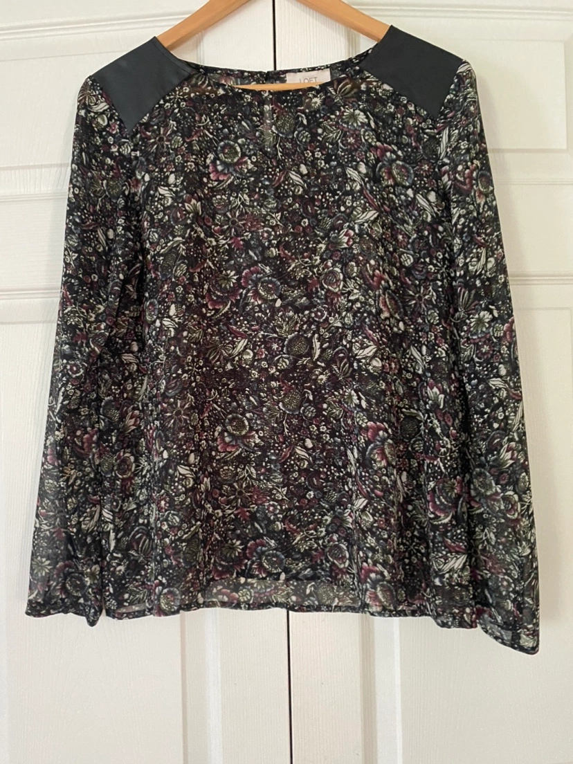 A black floral blouse with faux leather shoulder detailing. Long sleeves and a loose fit.