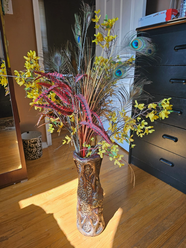 A beautiful, tall vase with a unique design. It would be a lovely addition to any home.