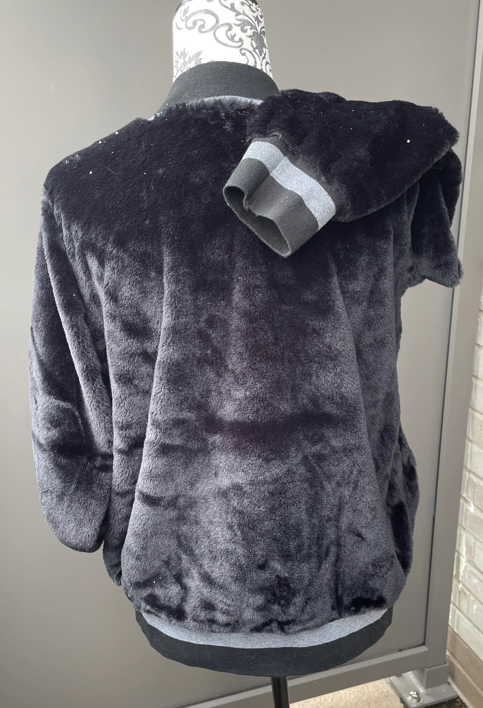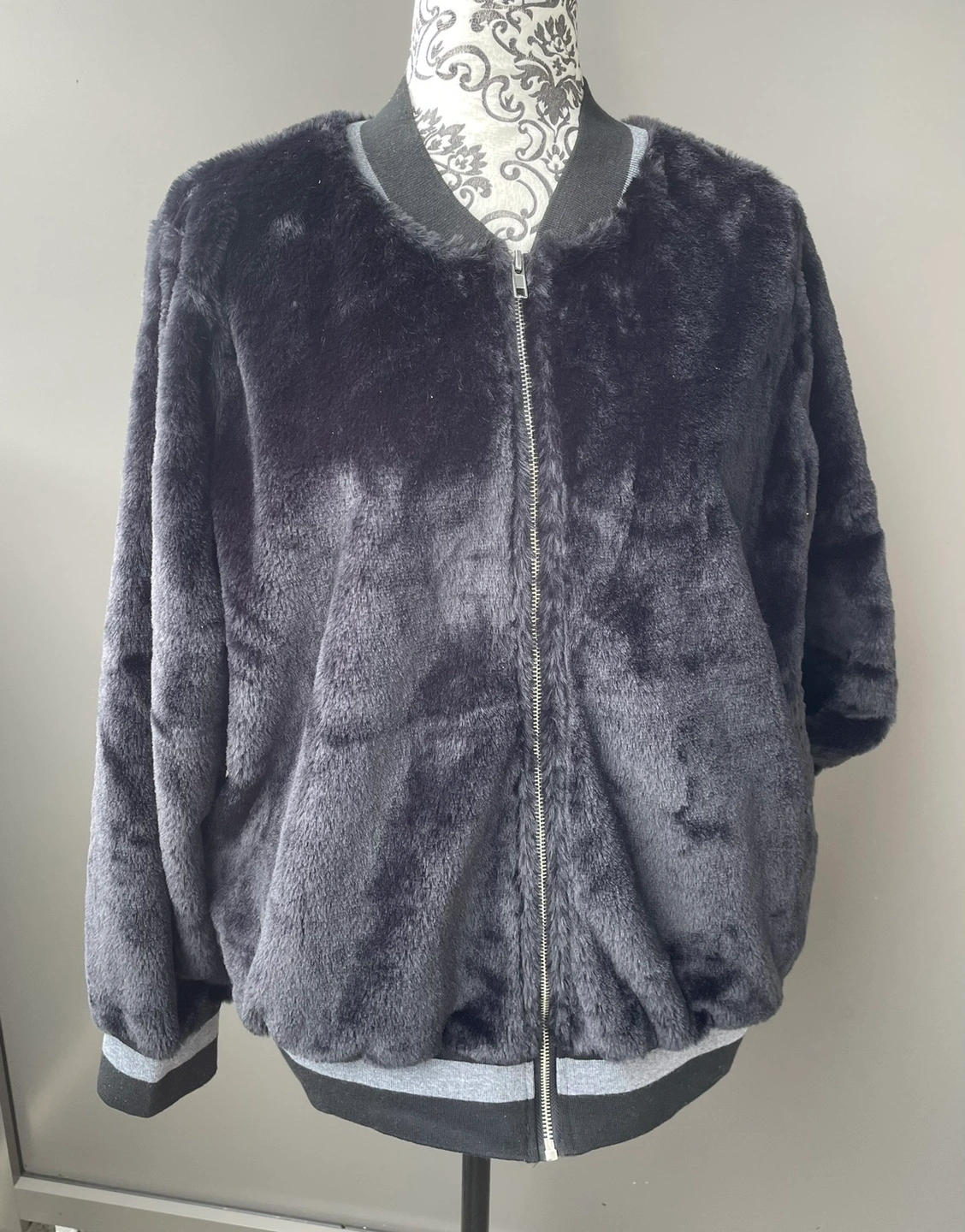 A black faux fur bomber jacket with grey ribbed trim around the cuffs and collar. It has a zipper closure in the front.worn once in new condition