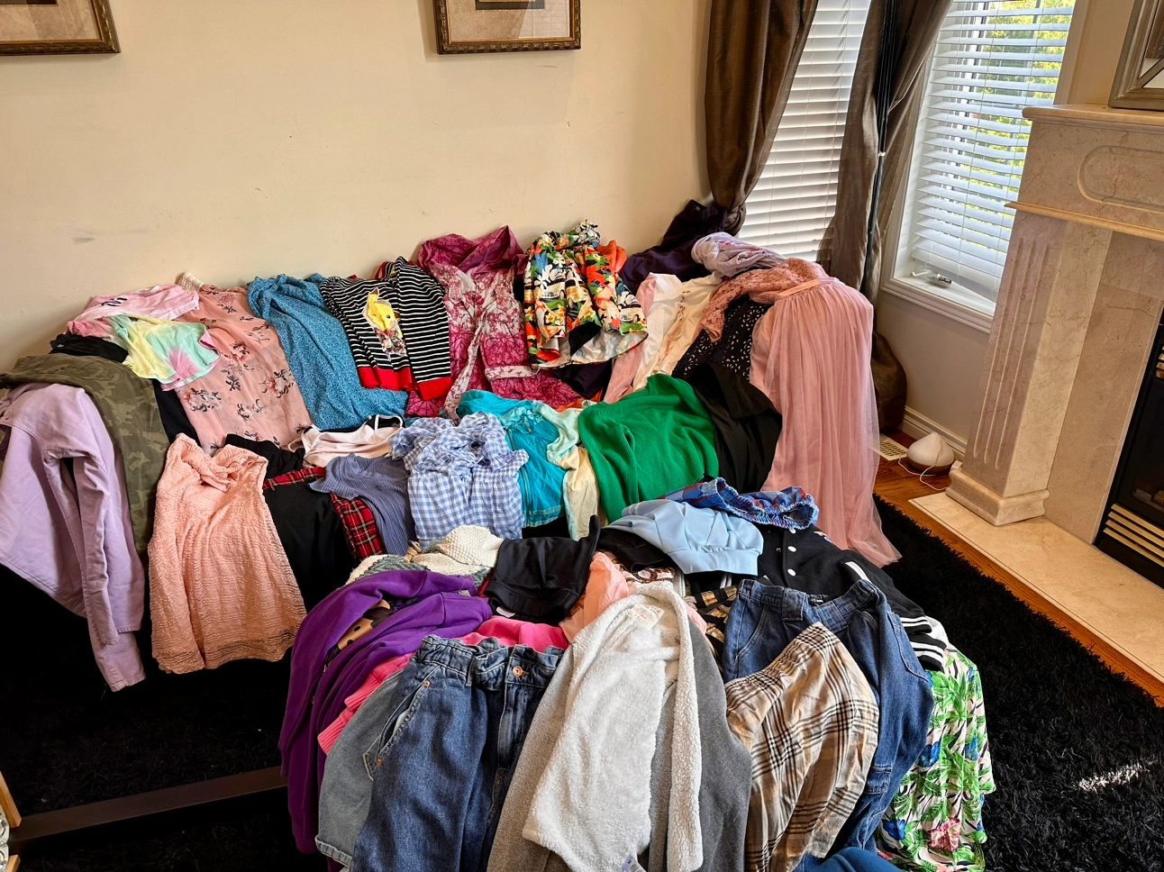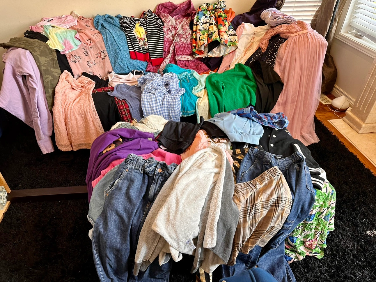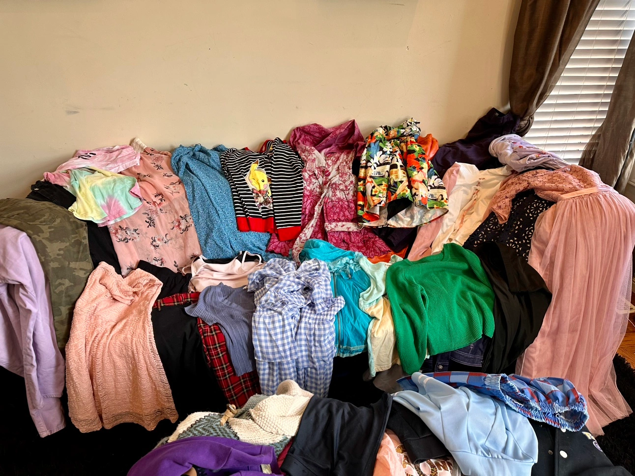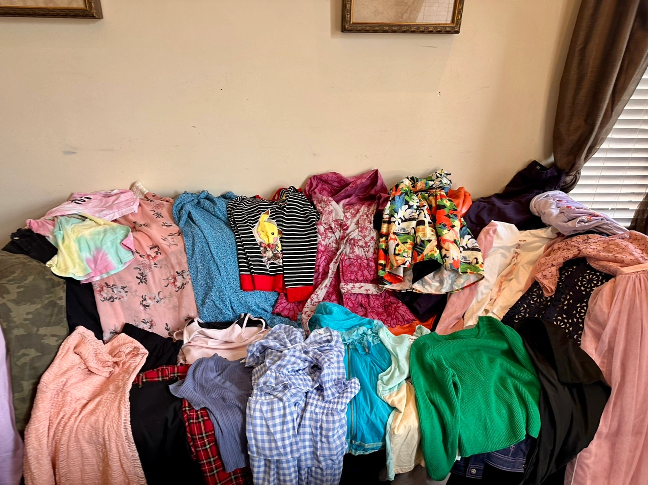 40A bundle of girls clothing in size 7-10. Includes tops, pants, shorts, skirts, and dresses.