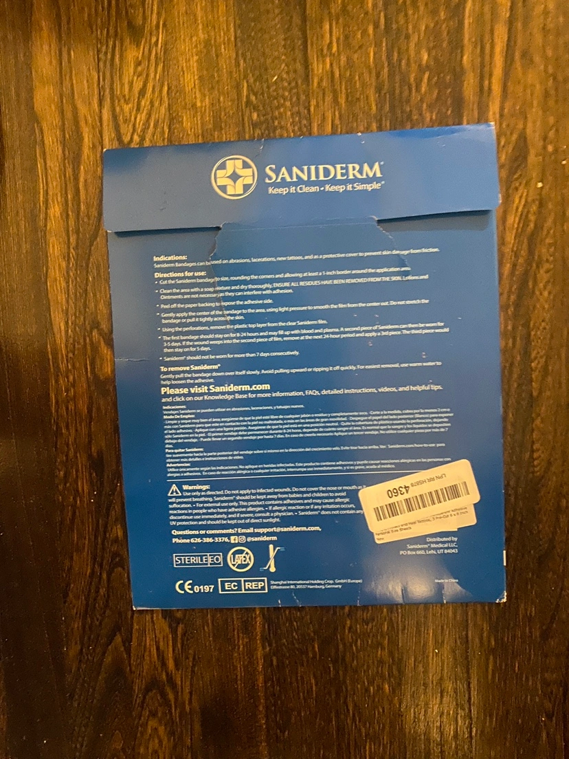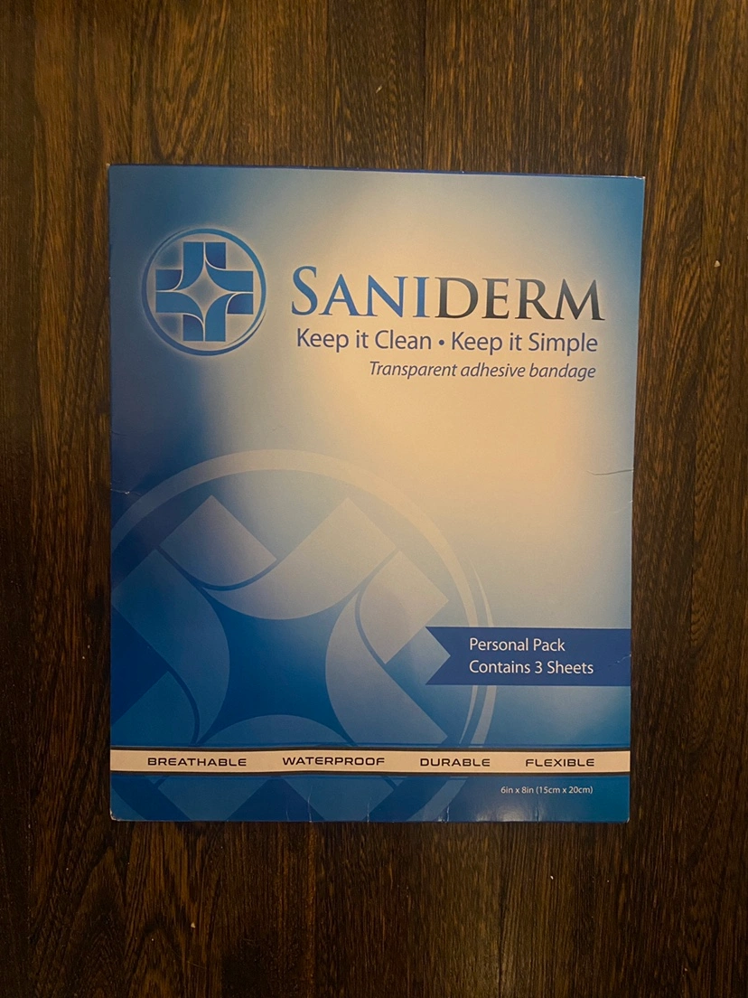 Personal Pack of 3 sheets, 6in x 8in, breathable, waterproof, durable, flexible. Keep it clean. Keep it simple. Saniderm’s tattoo wrap creates a barrier around your freshly tattooed skin, protecting it from dust, bacteria, moisture, and other external irritants. This transparent tattoo aftercare bandage is completely waterproof yet breathable to ensure that the skin receives the airflow it needs to heal and remain sweat-free. Using a product like Saniderm, specifically designed for tattoo aftercare, allows your tattoo to heal safely and look like the masterpiece it is. Whether it’s your back, arm, or any part of your body, large or small, Saniderm has got you covered, literally! Contains a pack of 3 individually sealed, sterile 6 x 8 inch Saniderm wound care dressings Self-adhesive Protects from bumps or accidental rubbing Box is open, but the 3 bandages inside are new inside sterile packaging. Pick up at Bathurst and Lawrence