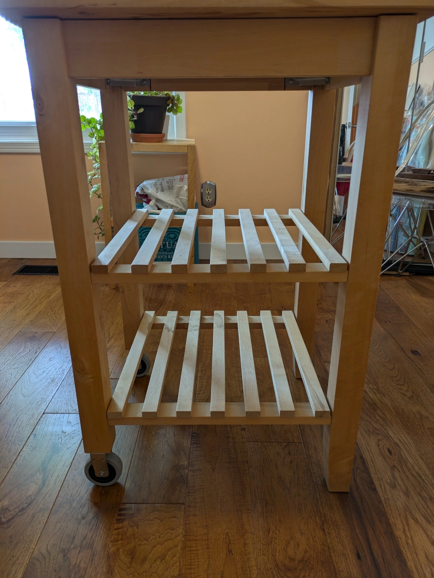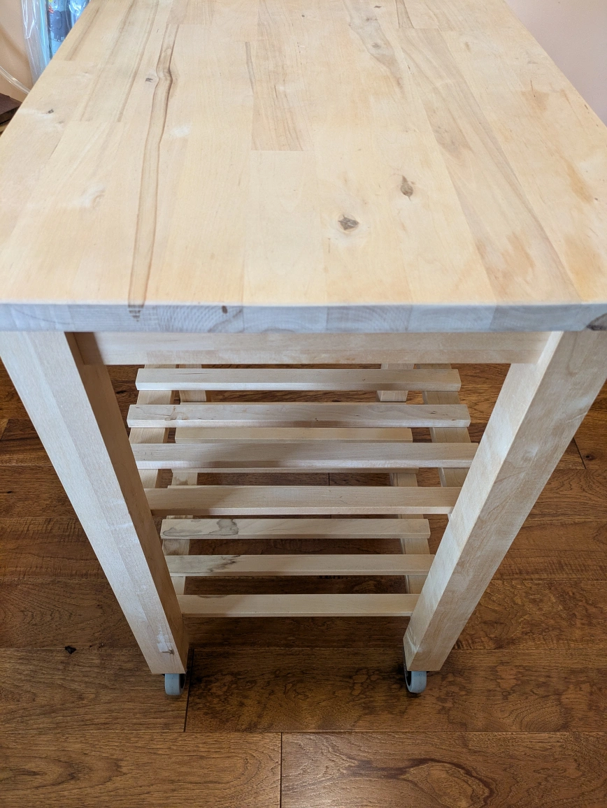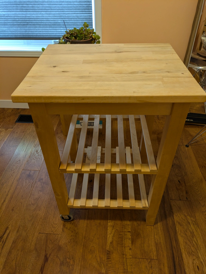 Ikea Bekvam solid wood cart features a wooden top, two shelves, and two wheels.