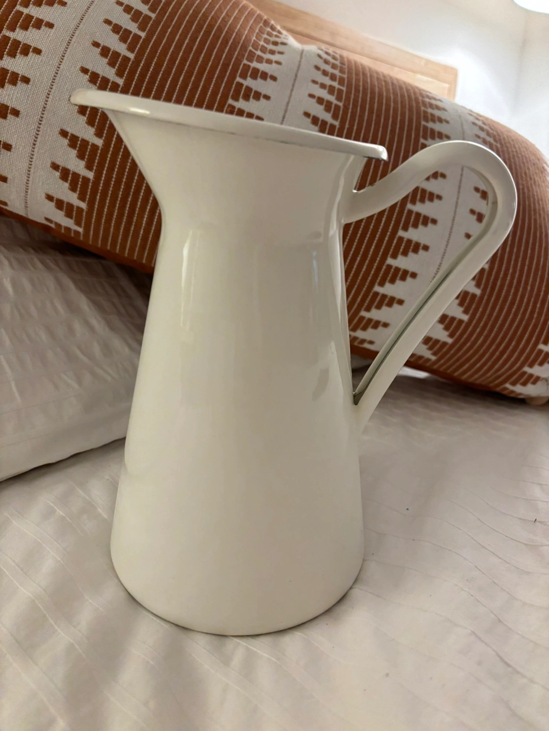 A white enamel pitcher with a handle. It is perfect for serving beverages, or as a vase for flowers.