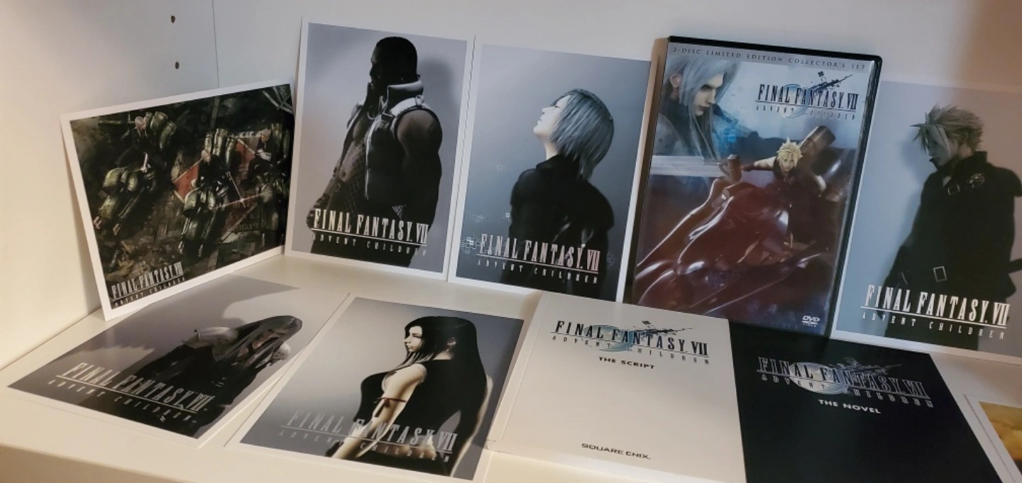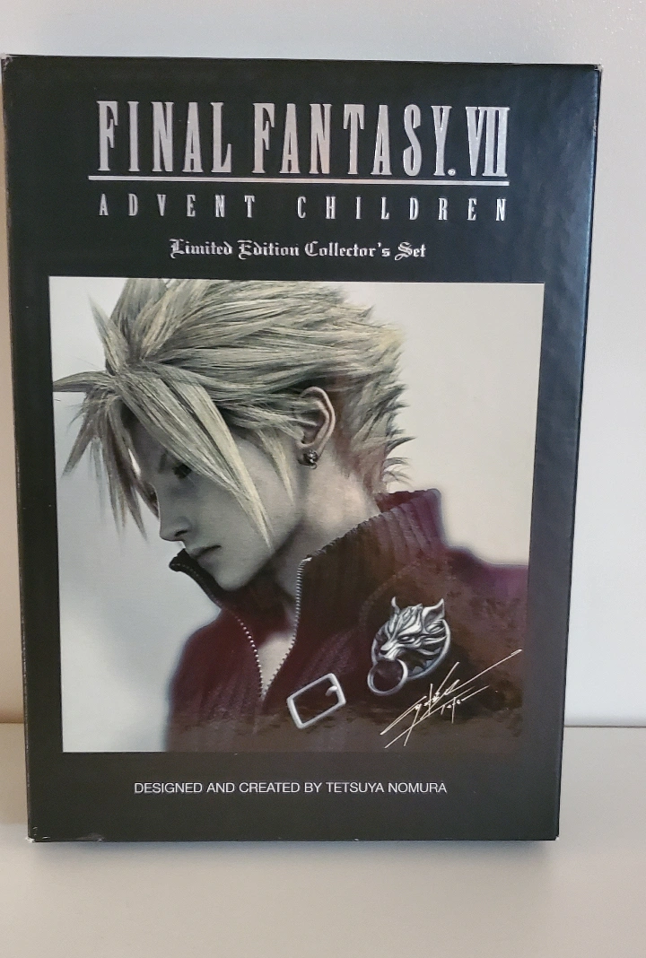 Limited edition collector's set. This set includes the DVD of Advent Children, the script, the novel, and 8 art cards. It is in excellent condition.