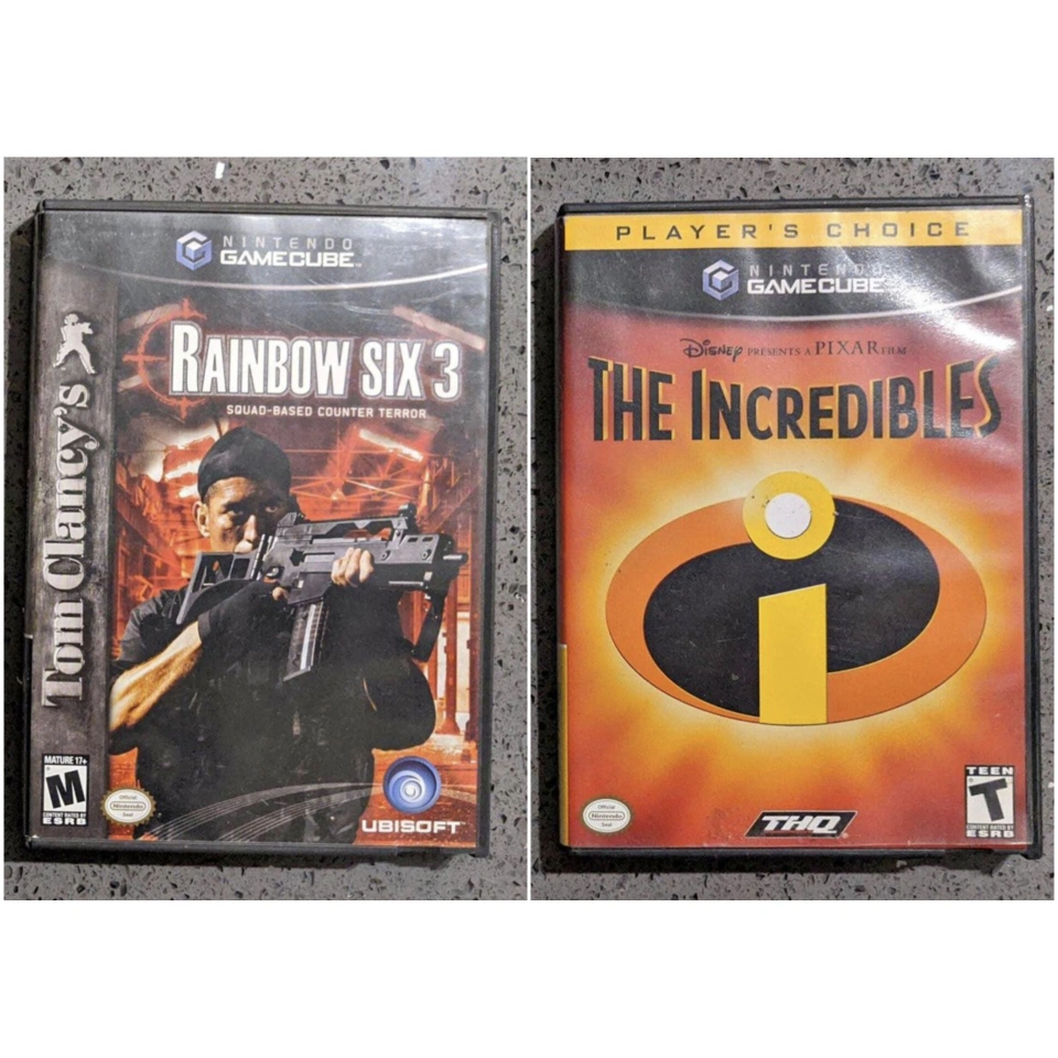 735Tom Clancy's Rainbow Six 3 Nintendo GameCube Video Game "Based on Unreal Engine 2, Raven Shield is a tactical shooter with realistic properties. Raven Shield moved toward mainstream first-person shooters like Counter-Strike, adapting various features absent in previous versions. These included the ability to see one's weapon while in the first-person view, new weapons and upgrades (including larger magazines and sights), and a revamped multiplayer. A console version, Tom Clancy's Rainbow Six 3, was developed and published by Ubisoft for the Xbox, PlayStation 2, and GameCube. This iteration of the game features the same basic engine, models, textures, and artwork, but with significantly different game mechanics, gameplay, and storyline. A port was also released on Mac OS X on December 19, 2003." The Incredibles (Disney) Nintendo GameCube Video Game "The Incredibles is an action-adventure video game based on Pixar's 2004 film of the same name developed by Heavy Iron Studios and published by THQ. The game was released for the Game Boy Advance, GameCube, Mac OS X, PlayStation 2, Windows and Xbox. Samuel L. Jackson (Frozone/Lucius Best), Spencer Fox (Dash), Sarah Vowell (Violet), and Jason Lee (Buddy Pine/Syndrome/Incrediboy) are the only actors to reprise their roles from the film, with the rest of the cast, including Craig T. Nelson and Holly Hunter, being replaced with other voice actors - the original movie dialogue and can be heard in cutscenes taken directly from the film.[6] The game's music was composed by Michael Giacchino, who also scored the film. The console versions of the game received a T rating from the ESRB, making this the only Pixar video game to receive that rating"