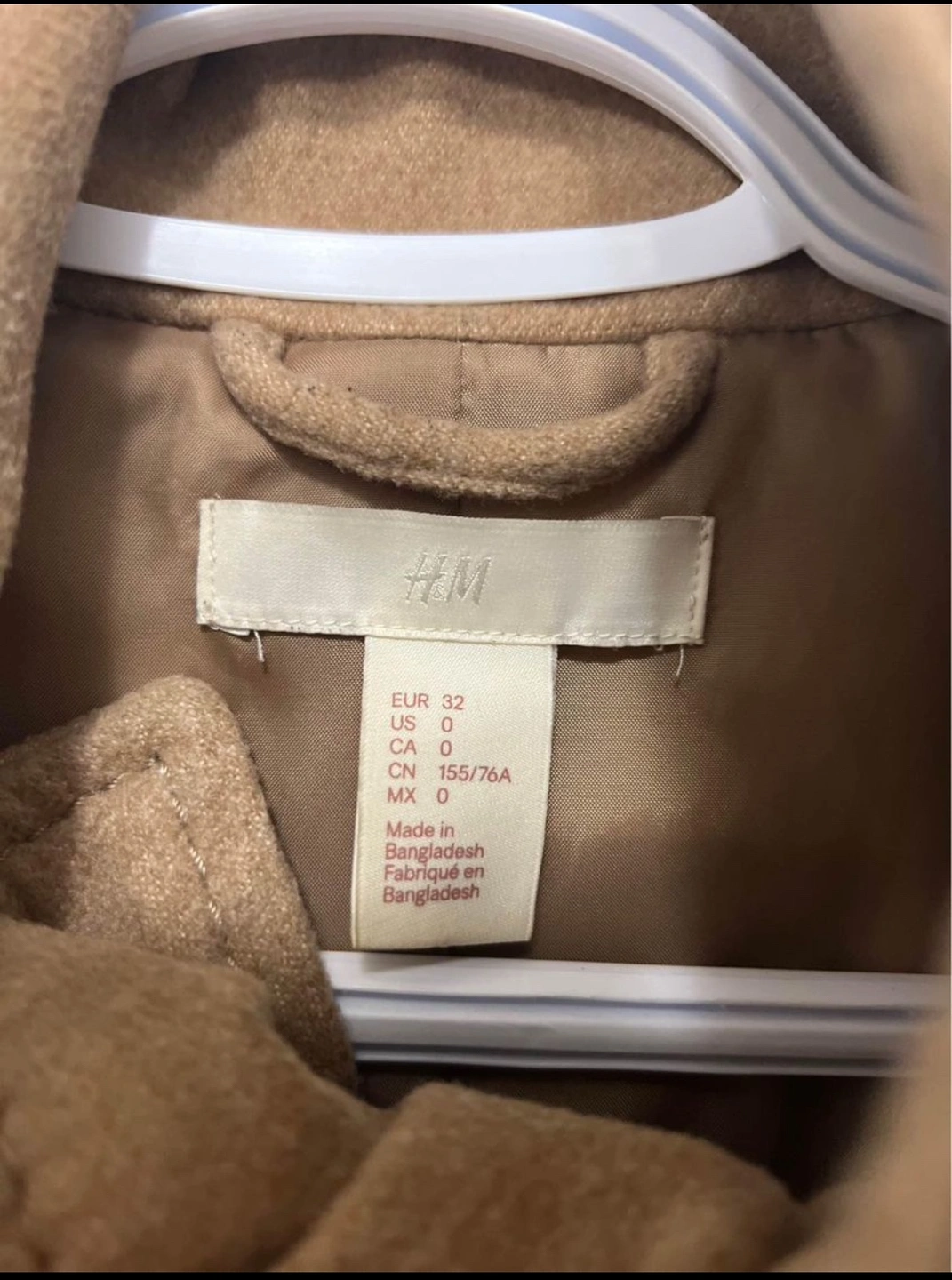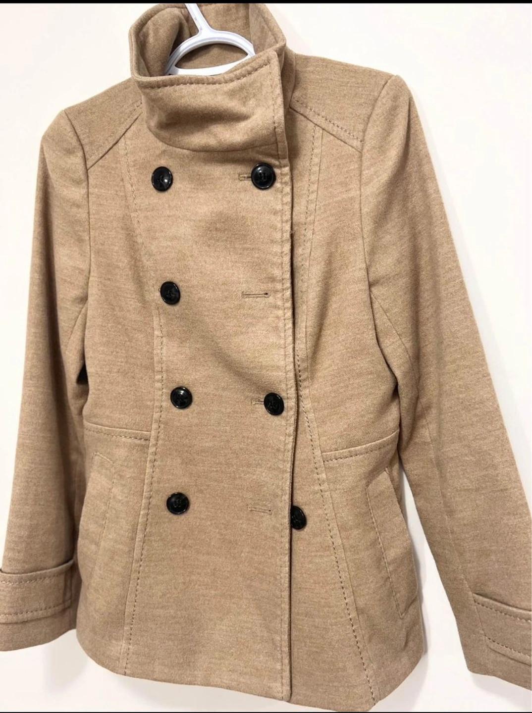 This women's peacoat from H&M is tan in colour. It has a double-breasted front with black buttons and a high collar. It is in good condition.