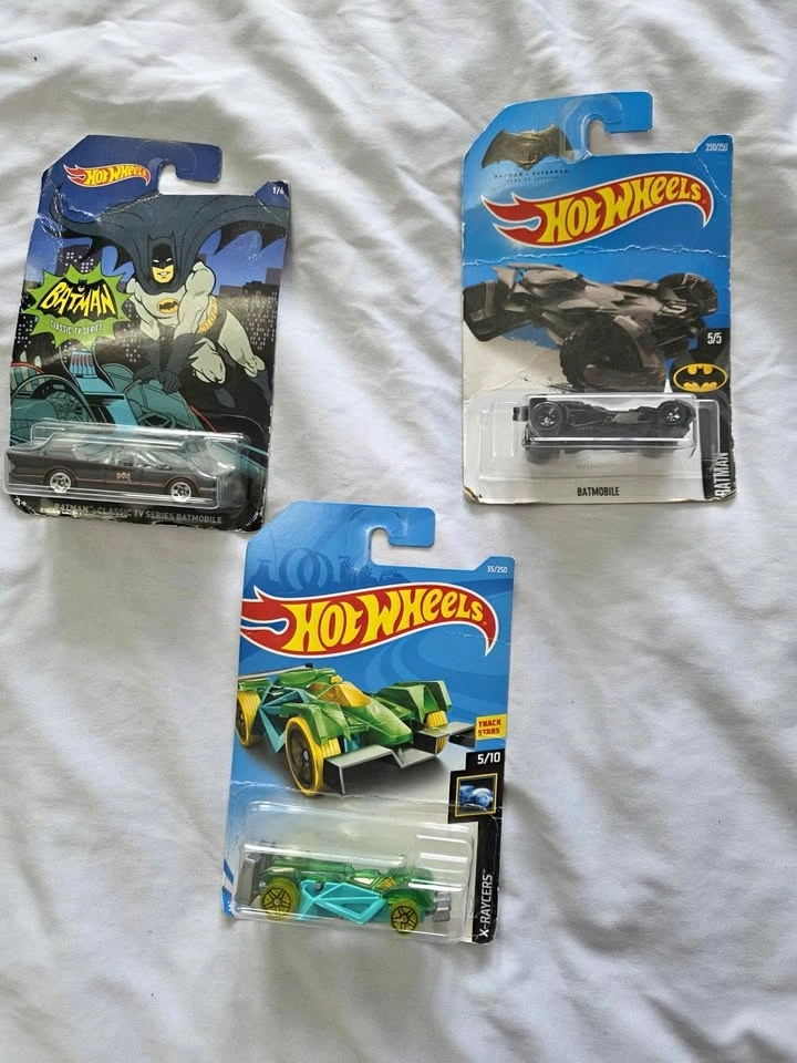 This 3-car lot features iconic versions of the Caped Crusader's ride: Batman Classic TV Series Batmobile (Black w/ Red trim), Batman v Superman Batmobile (Tactical Matte Black), and X-Raycers Track Stars Batmobile (Translucent Green). All cars are New-in-Package (NIP). Cards show some light storage wear.