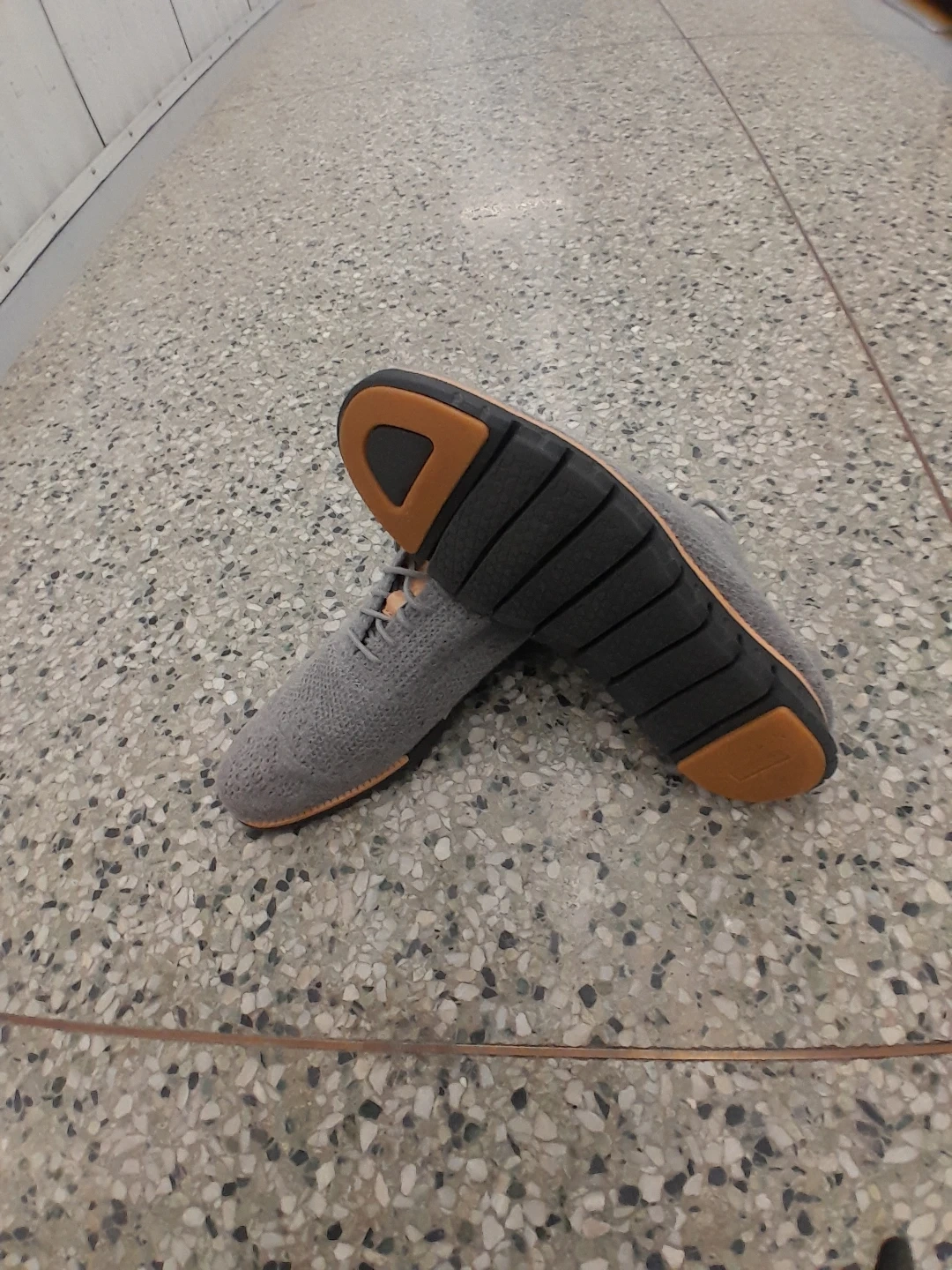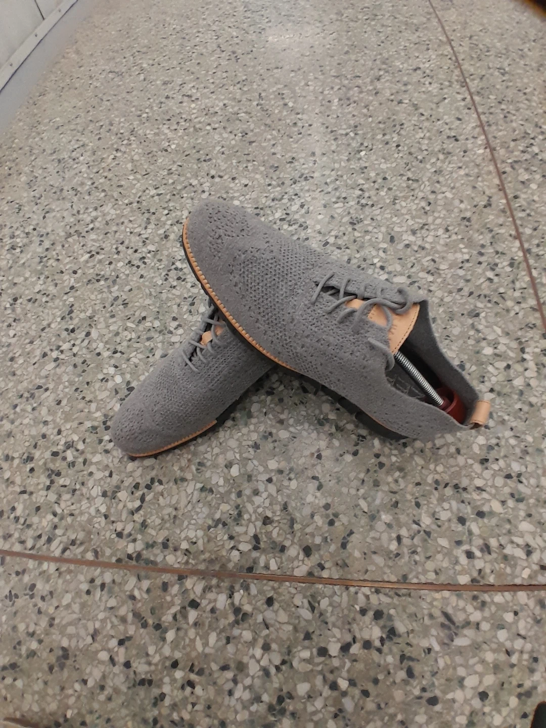 These grey knit shoes have a dress shoes style. They feature a cushioned sole with tan accents. This footwear offers a comfortable and casual look Men's size 10