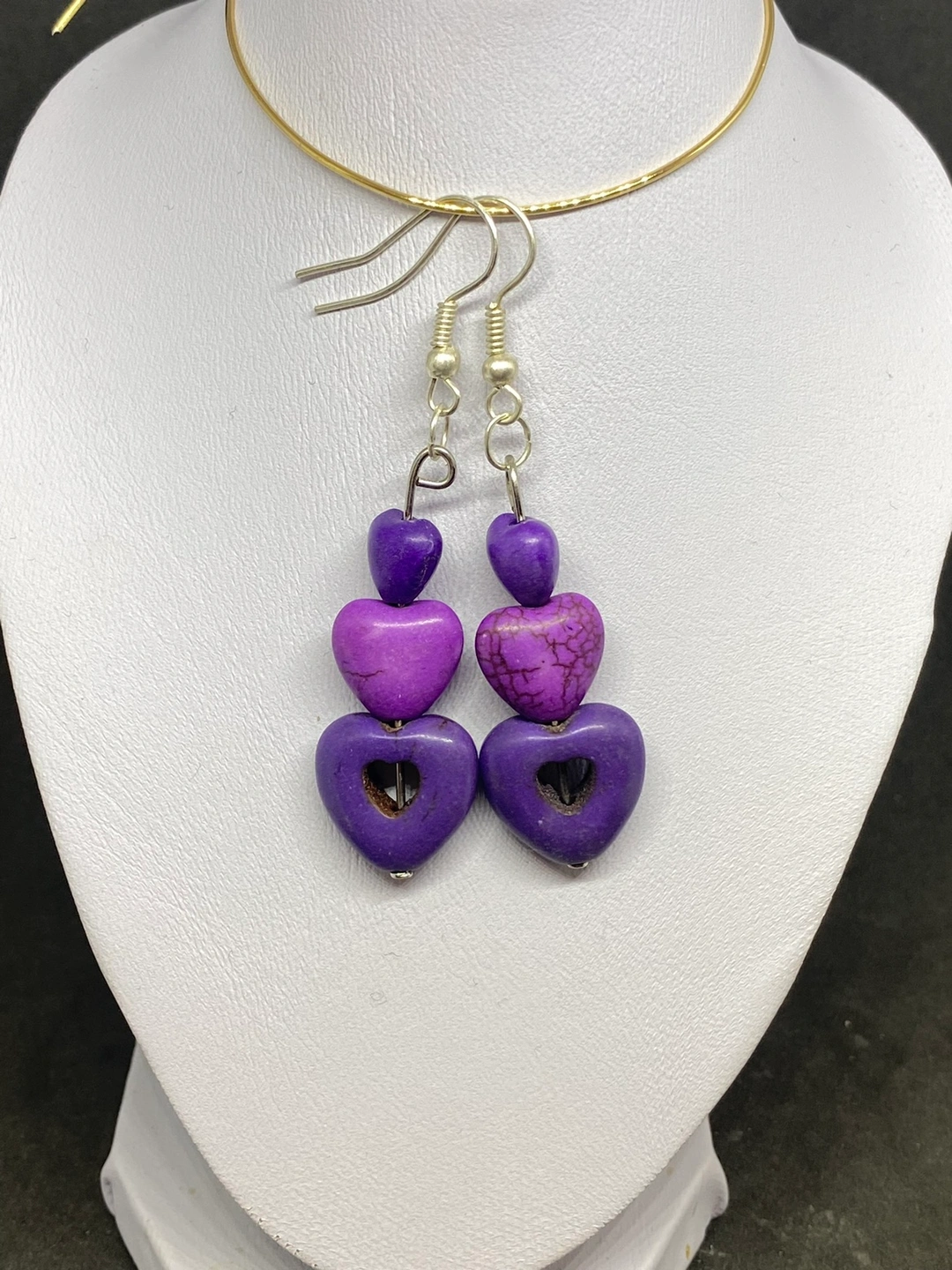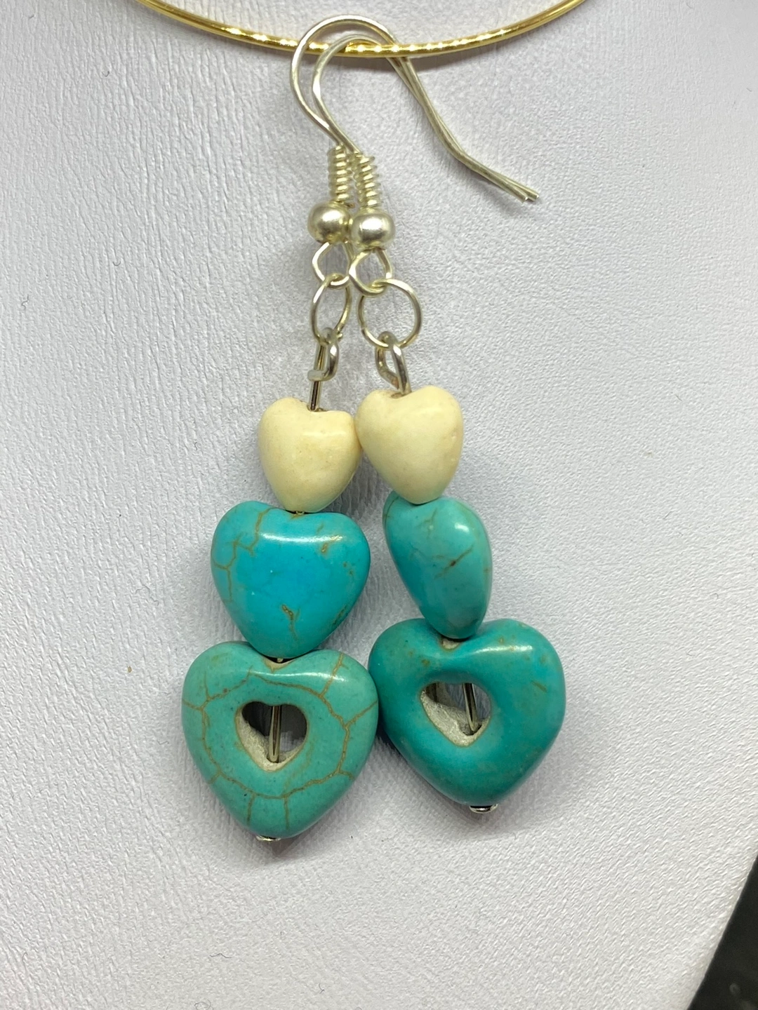 Three heart-shaped beads on each earring. All earrings are made with howlite semi precious stones. Colored ones are dyed howlite.