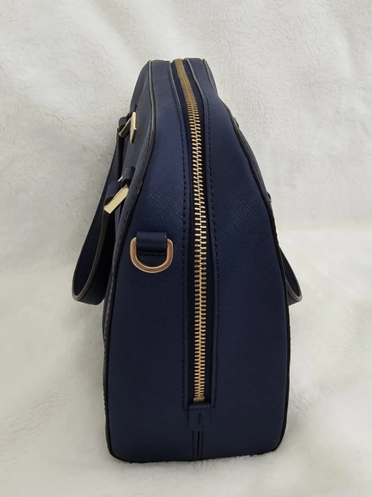It is navy blue in colour and has a gold tone zipper and hardware. This handbag can be worn as a shoulder bag or a handbag.