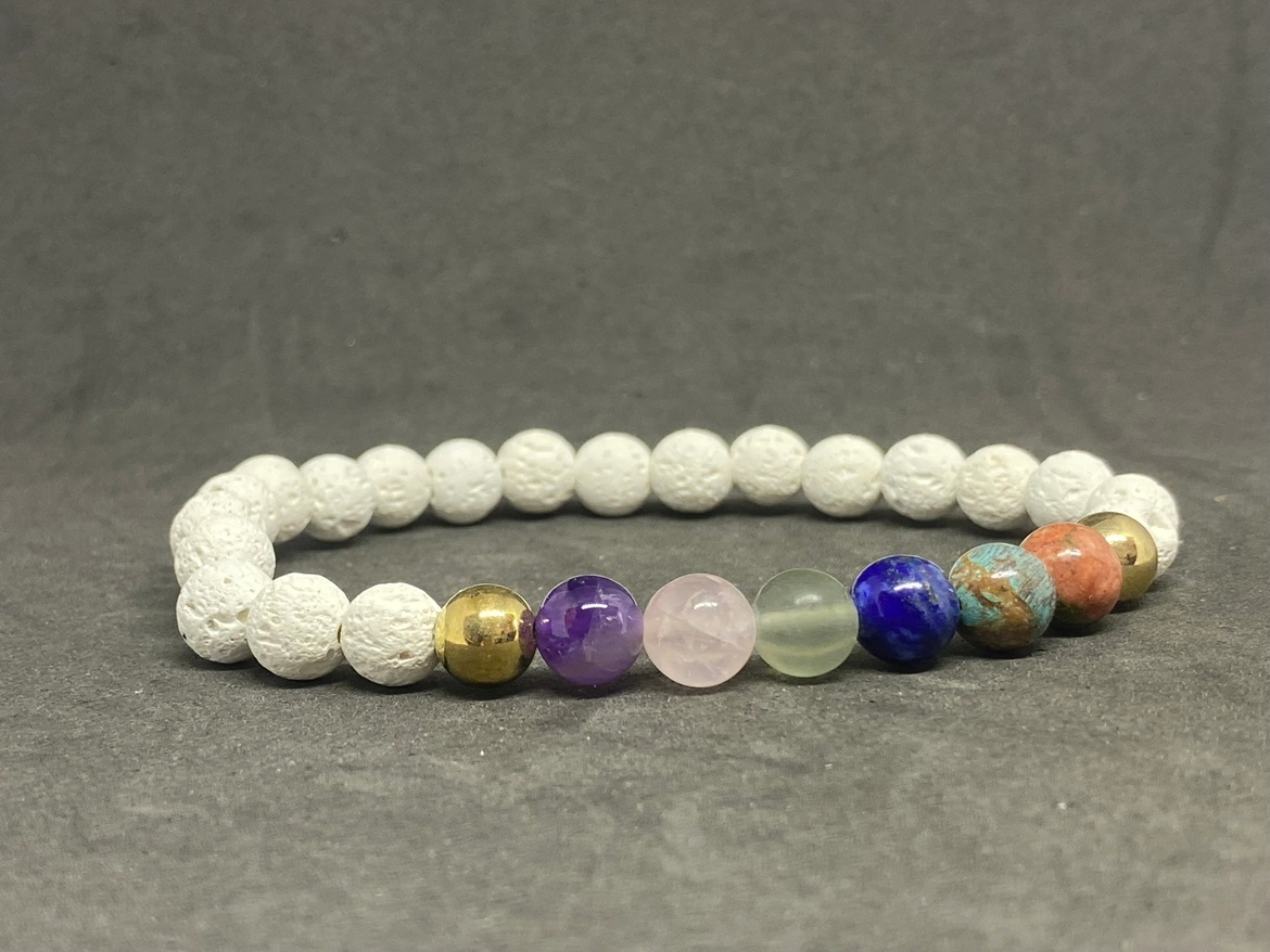 127This bracelet features lava stone beads with a variety of gemstones handmade. It has a stretchy band and is approximately 7 inches long. $20.00 each. Makes a great gift and you can fully customize! Message for more details. The last 2 pictures are not made with lava stones but they are made with semi precious stones