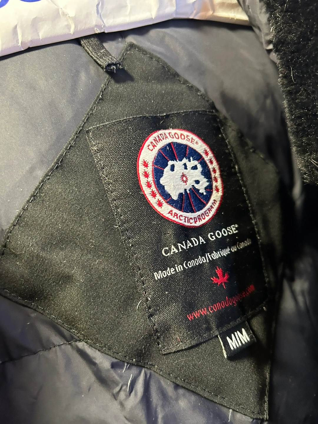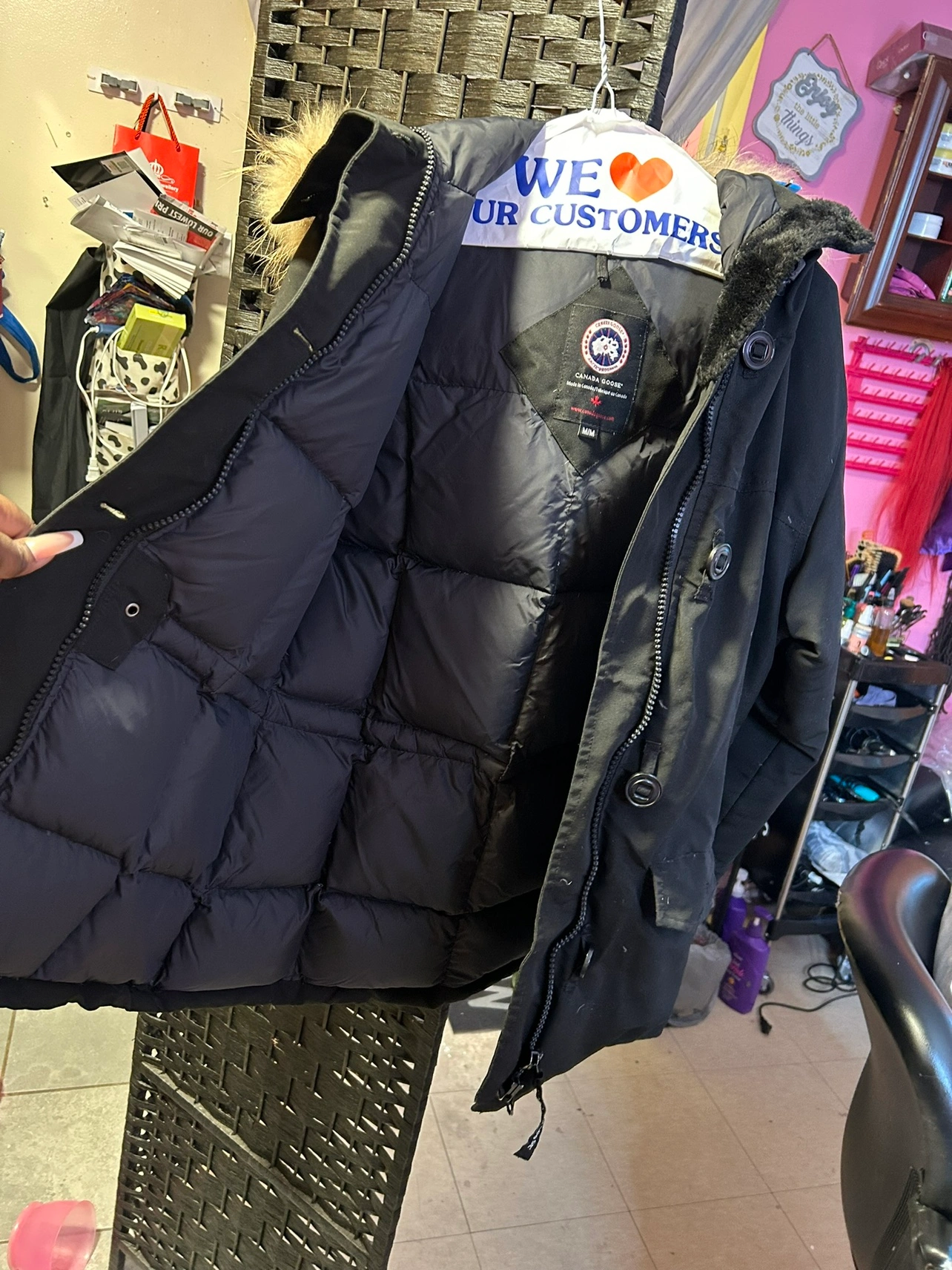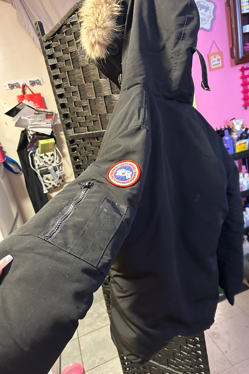 Black Canada Goose jacket. It has a fur-lined hood. There is a zipper and button closure. The jacket also has two side pockets and an inside pocket.
