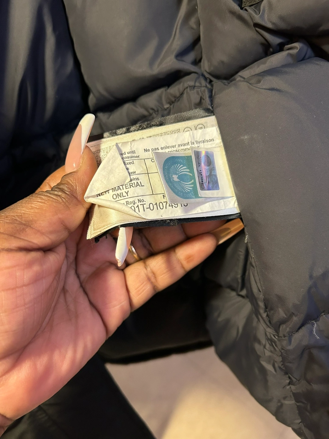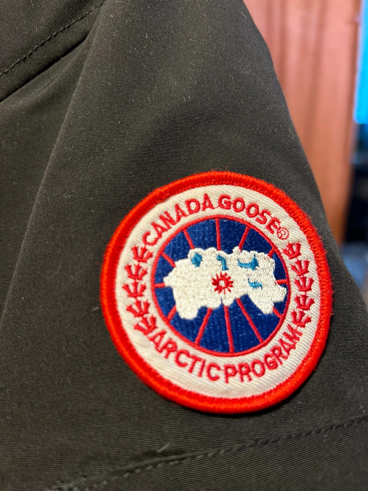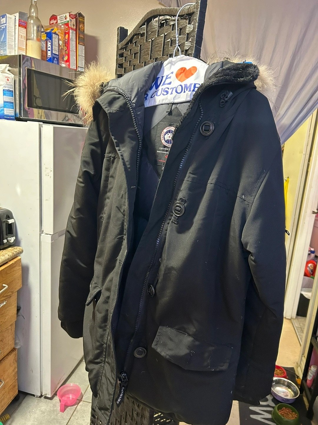 Black Canada Goose jacket. It has a fur-lined hood. There is a zipper and button closure. The jacket also has two side pockets and an inside pocket.