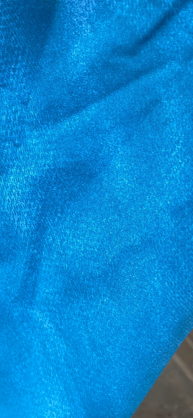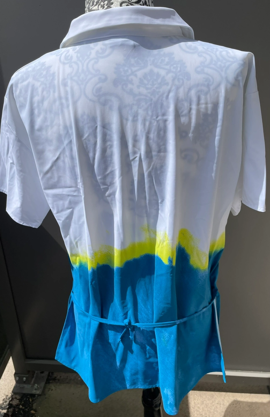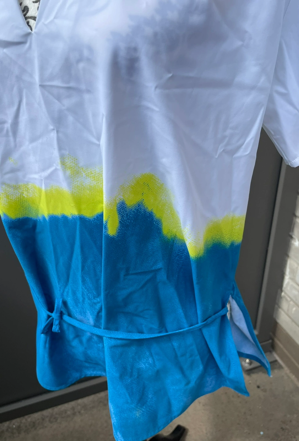 Short-sleeved scrubs top with a tie-dye pattern in white, yellow, and blue. It has a V-neck and ties in the back. It is a size medium. This would be suitable as a service scrubs top