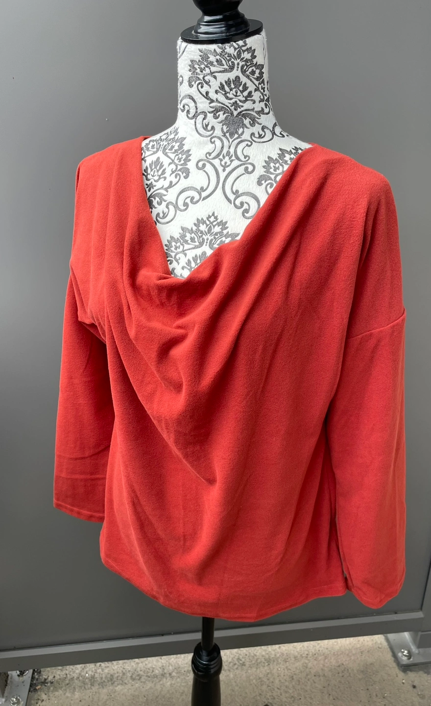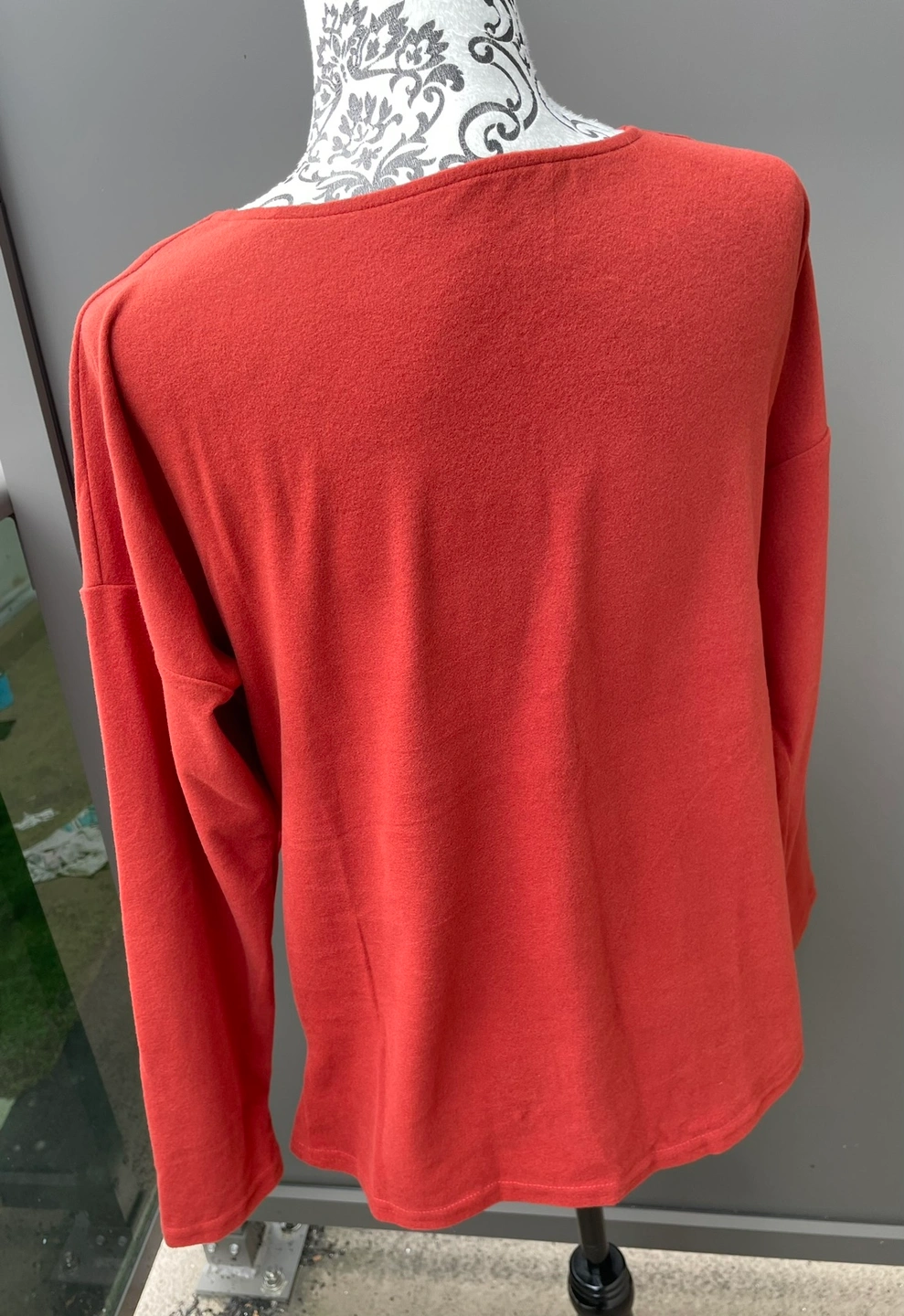 851This is a long sleeve top with a scoop neck. It is a rust colour and is made of a soft, comfortable fabric. It is new never worn, very lightweight fabric.