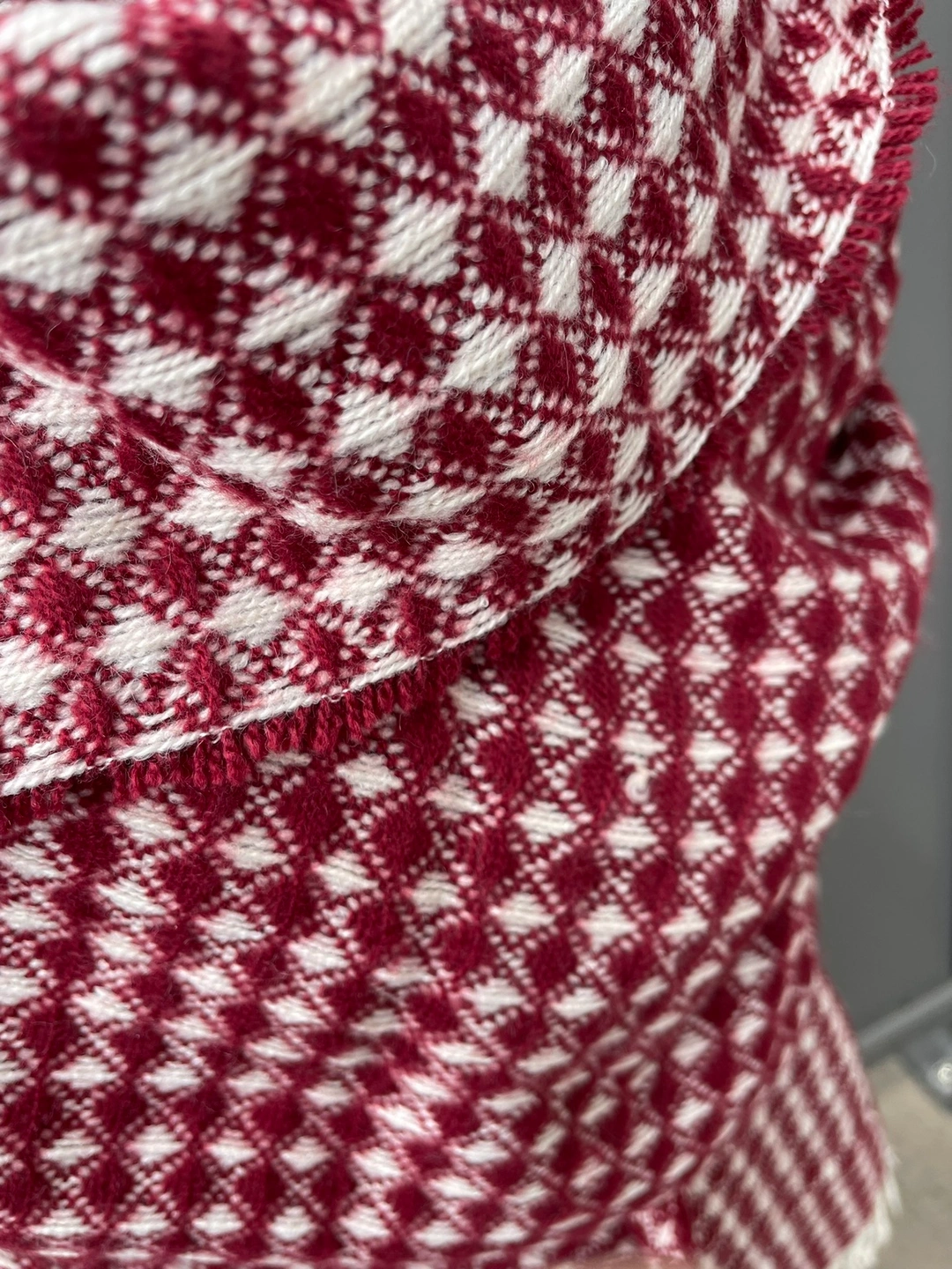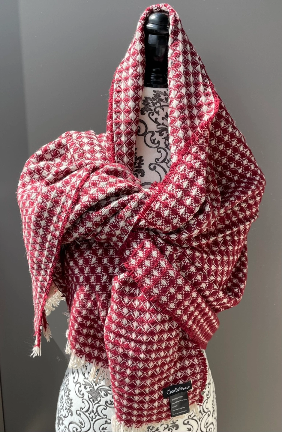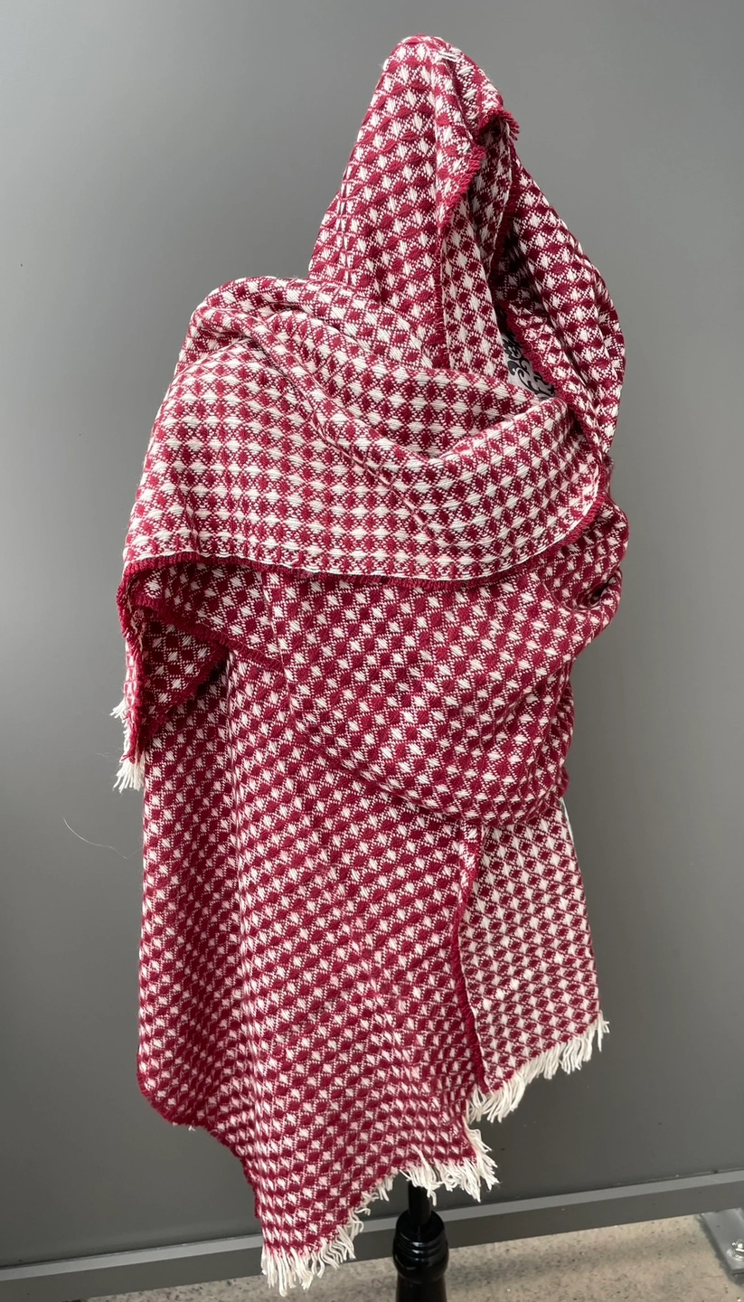 A beautiful red and white scarf with a geometric design. The scarf is made from a soft and comfortable material. It is a great way to add a touch of style to your winter wardrobe.