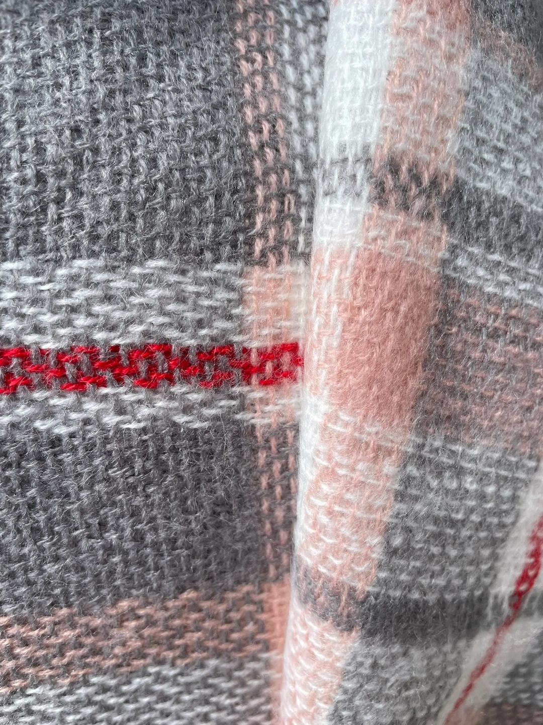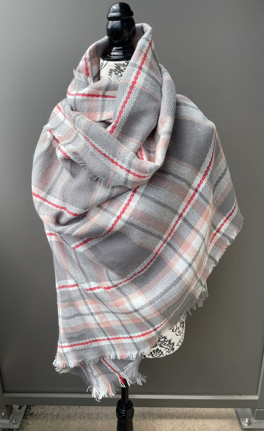 851A soft, warm grey and pink plaid scarf with fringed edges. Large wrap