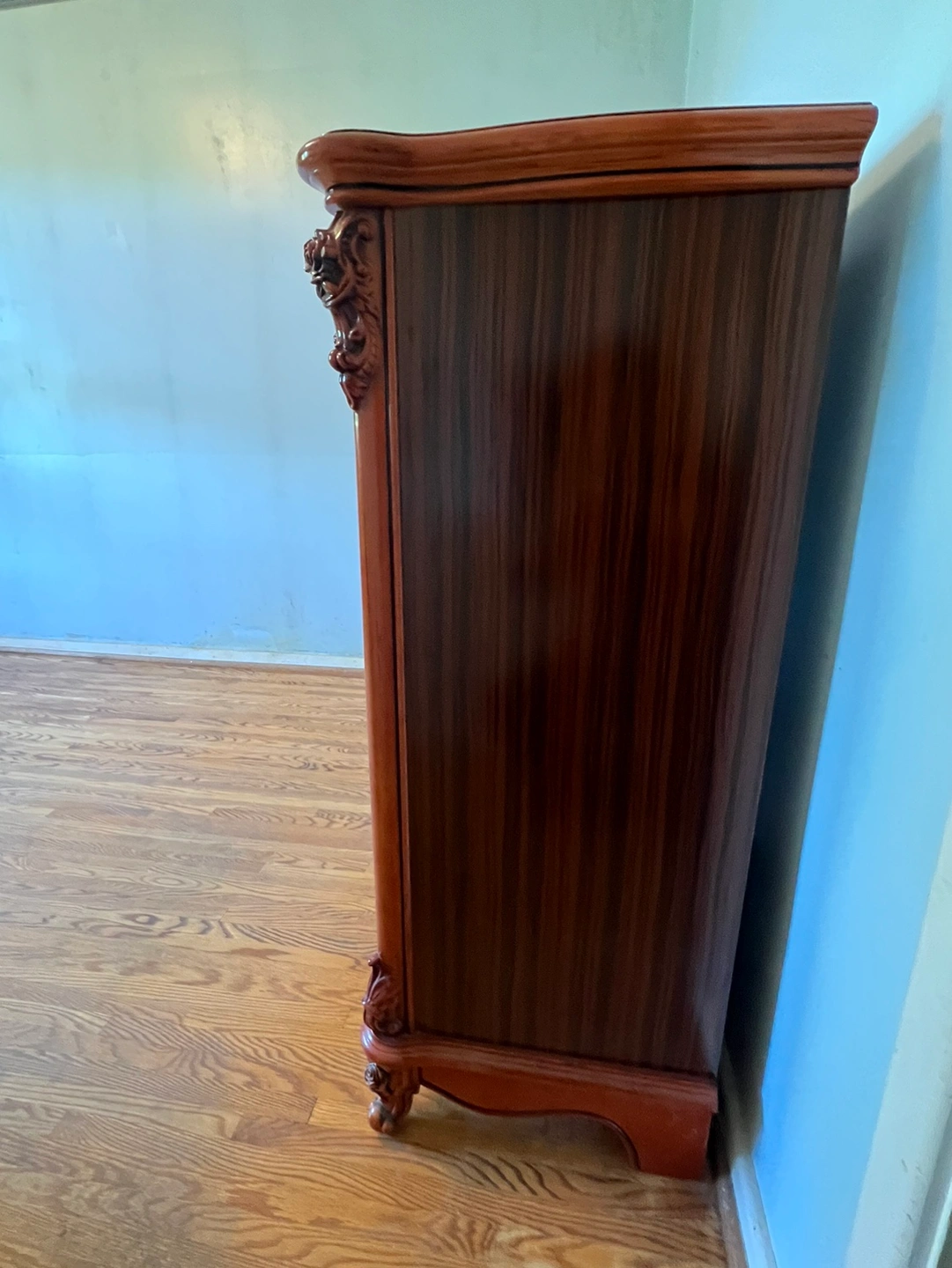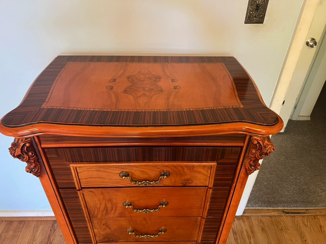 This beautiful chest has an intricate wood design, five spacious drawers, and ornate detailing.
