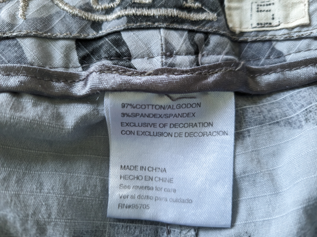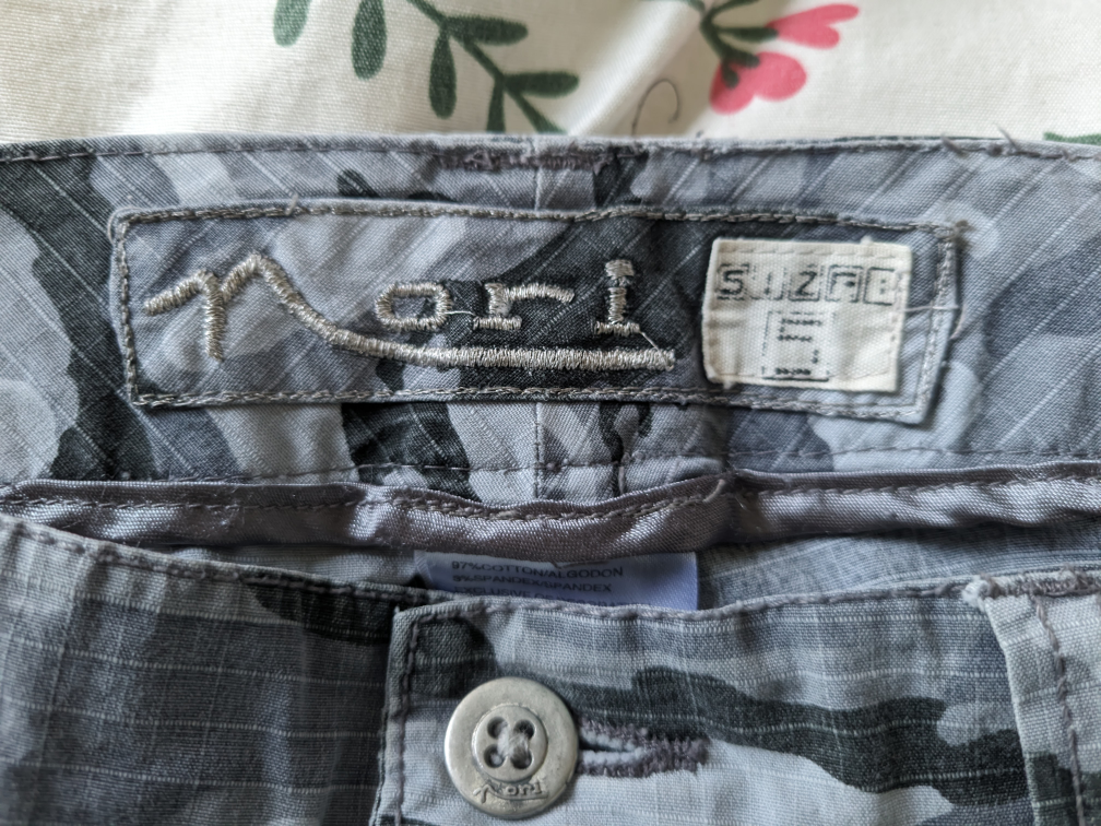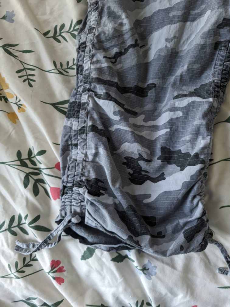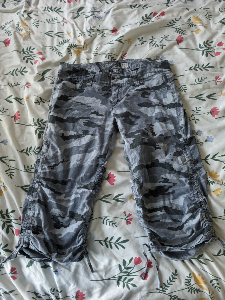 Size 5 grey camo capris from the 2000s brand Nori. They are a low-rise with a super cute drawstring at the bottom. Made from 97% cotton and 3% spandex!