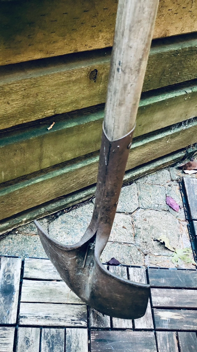A garden shovel with a wooden handle. Perfect for gardening, digging, and other outdoor tasks. Needs a cleaning. It works great. No damage to shovel or wood. Just needs a proper cleaning.