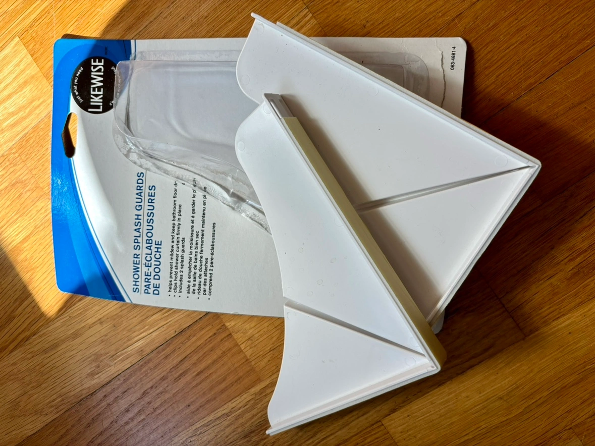 These guards are perfect to help prevent mildew and keep your bathroom floor dry. They help keep your shower curtain firmly in place. The package contains 2 splash guards. Package opened but never used.