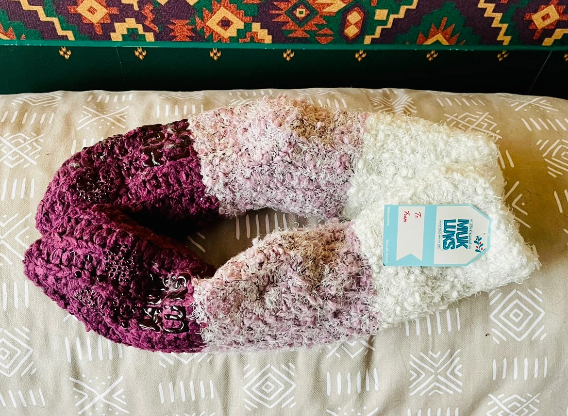 Muk Luks colour block Purple, grey and white fuzzy slipper socks. Grips on the foot bottom to prevent slipping.