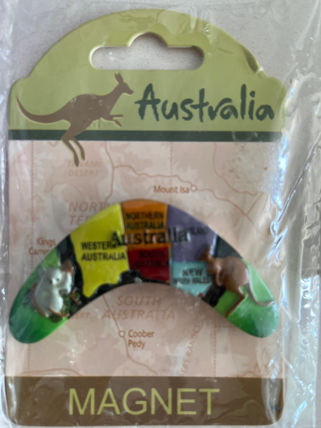 A souvenir fridge magnet in the shape of Australia, with each state coloured differently. The magnet also includes a kangaroo, koala.