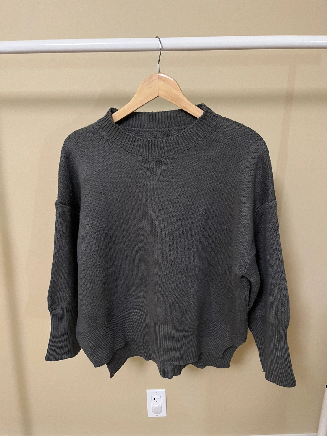 A grey knit sweater with long sleeves and a round neckline. It is a loose fit and has a slightly cropped hem. The sweater is in a soft, comfortable material. It is perfect for layering or wearing on its own. It is a great option for casual wear.