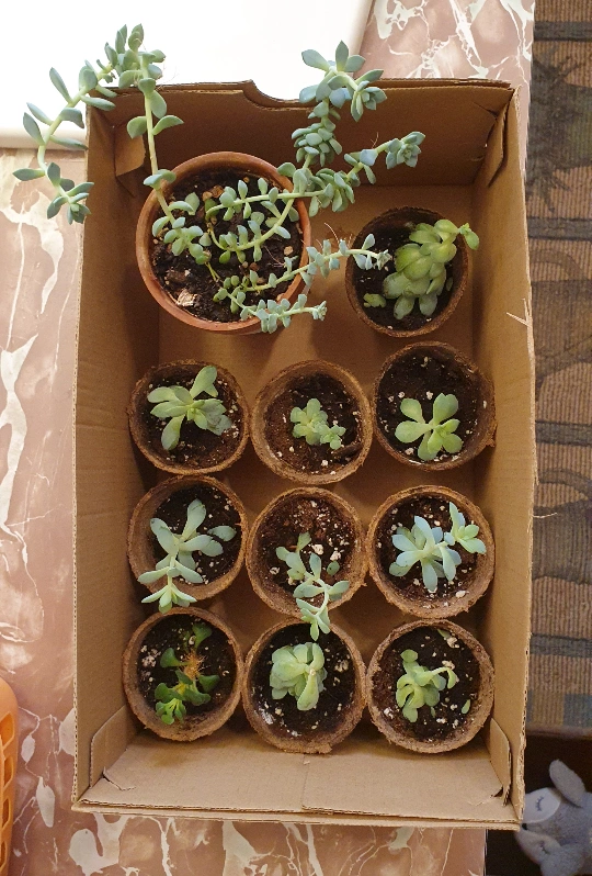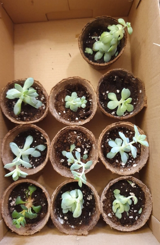 11 assorted succulent plants - 1 larger plant(s) in a terracotta pot and 10 smaller plants in biodegradable planters. They are healthy and well-established, and will thrive in your home! Yes, they can be easily propagated! Each fleshy leaf can become a whole new succulent plant just by placing it on damp soil and indirect sunlight βοΈ