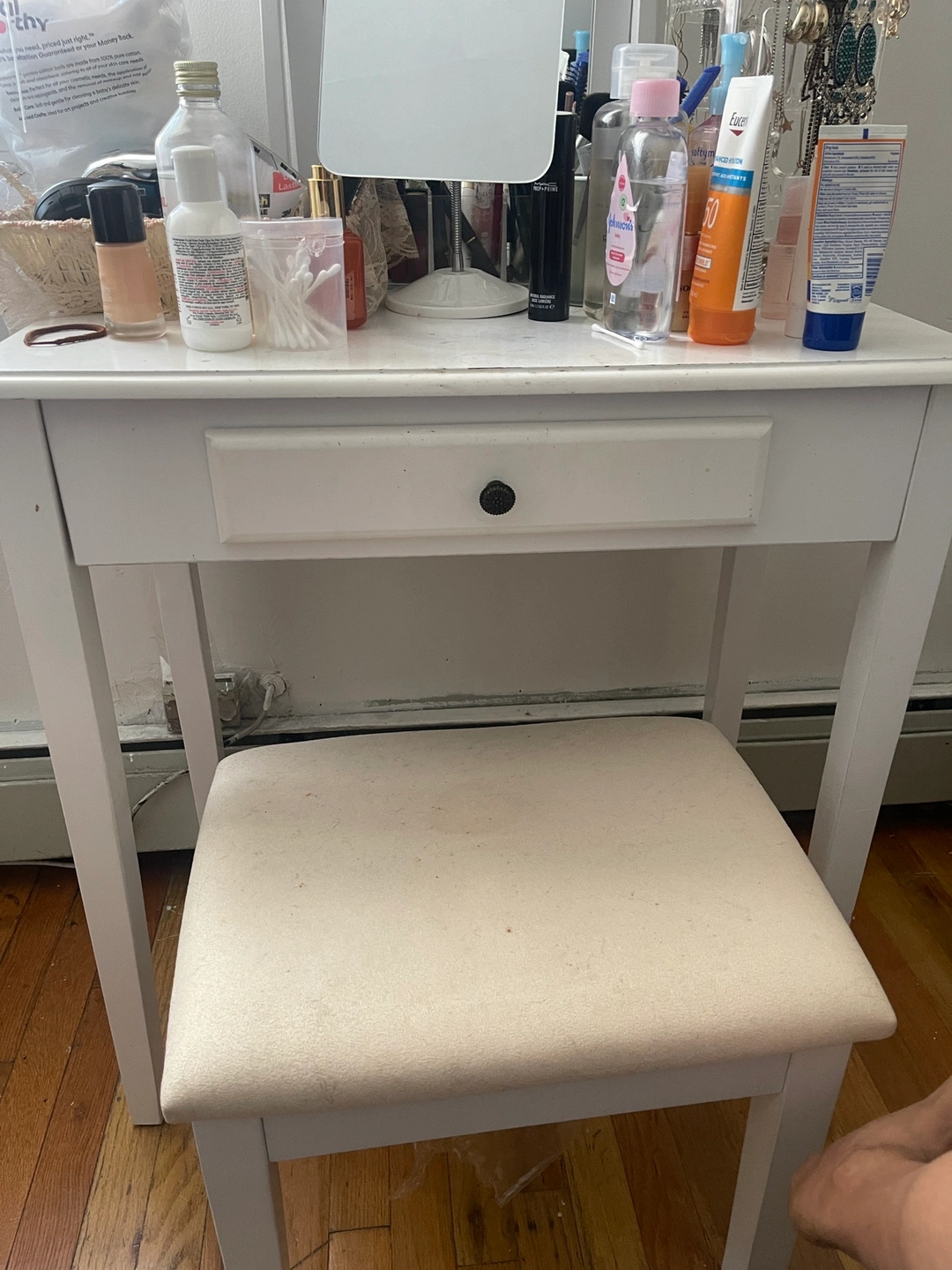 Vanity set includes a white vanity table with one drawer and a matching white stool. The vanity has a white tabletop that is perfect for holding makeup and other beauty products. The stool is padded and upholstered in a soft white fabric. Moving out sale