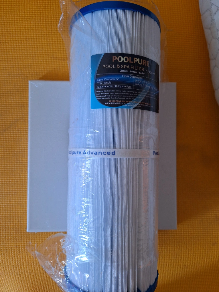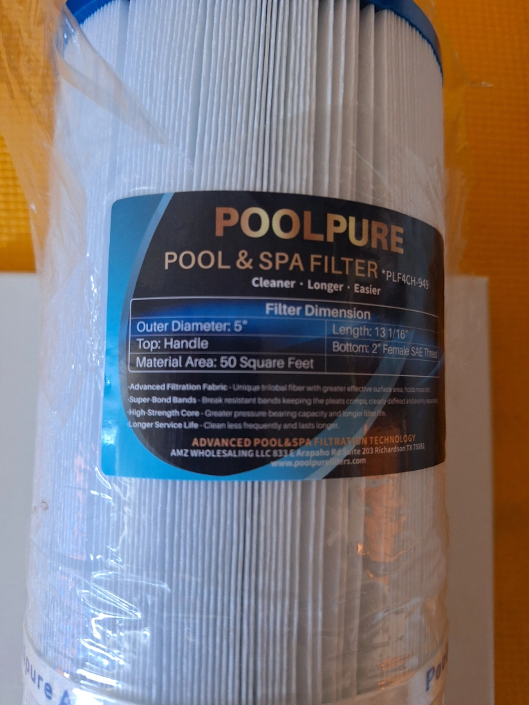 Poolpure Pool & Spa Filter, model PLF4CH-245. 5 inch outer diameter, 13-1/16 inch length, 50 square feet of material area.