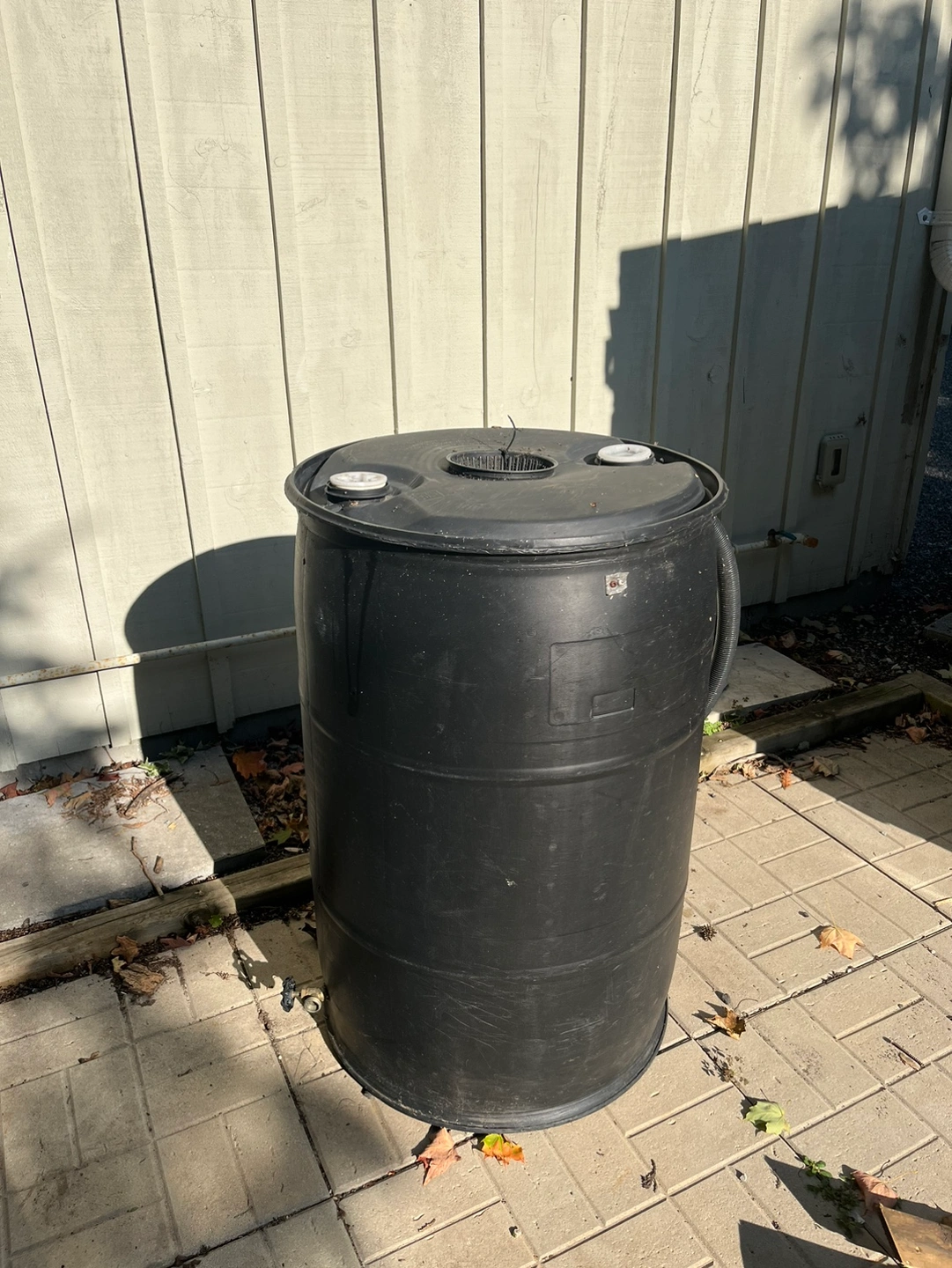 Large black rain barrel with a tap and a hose. Includes screen and lid. Suitable for collecting rain water. A great way to water plants and save money on your water bill.