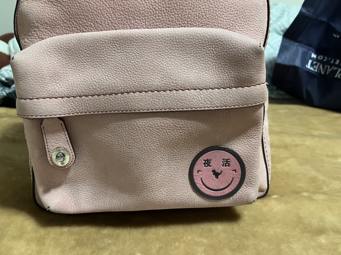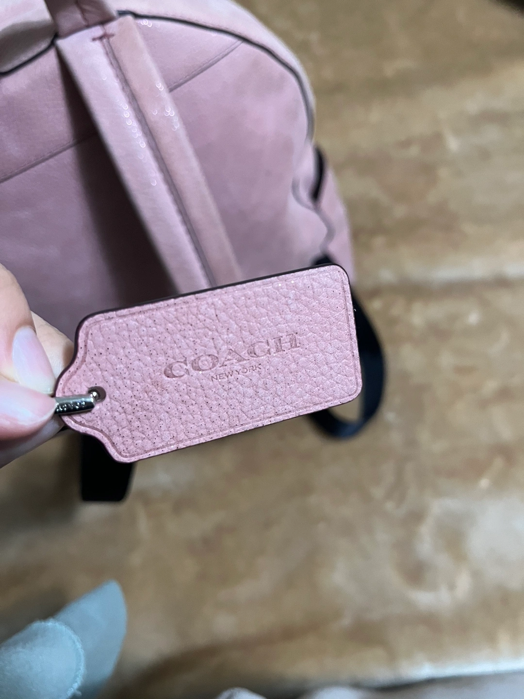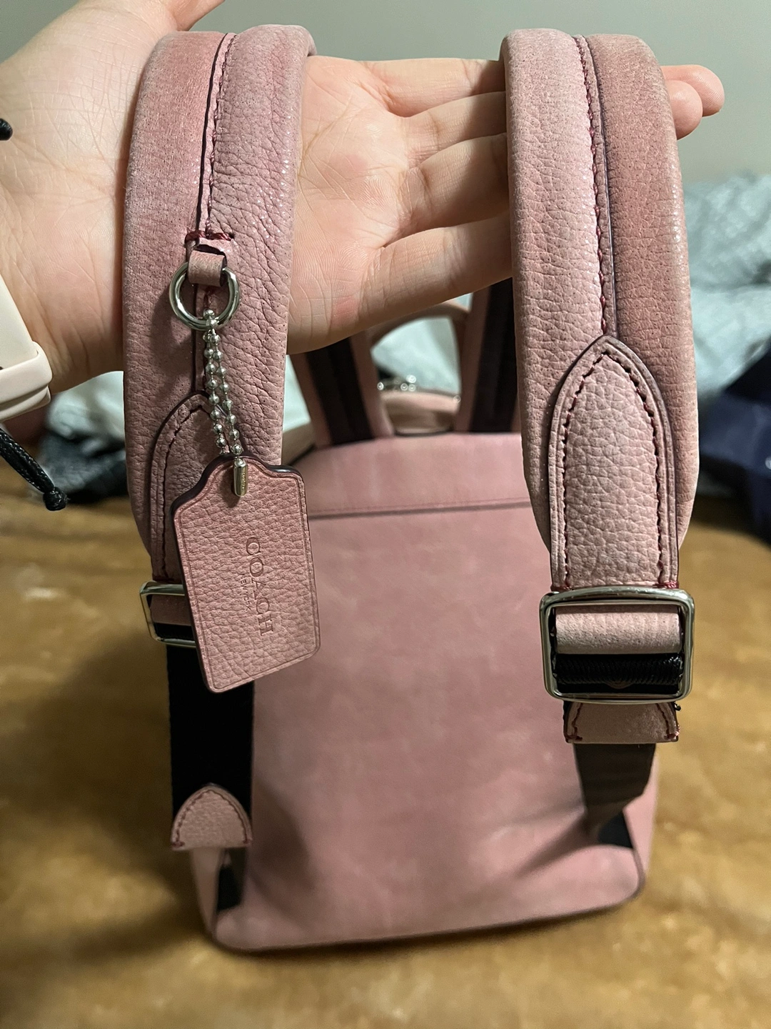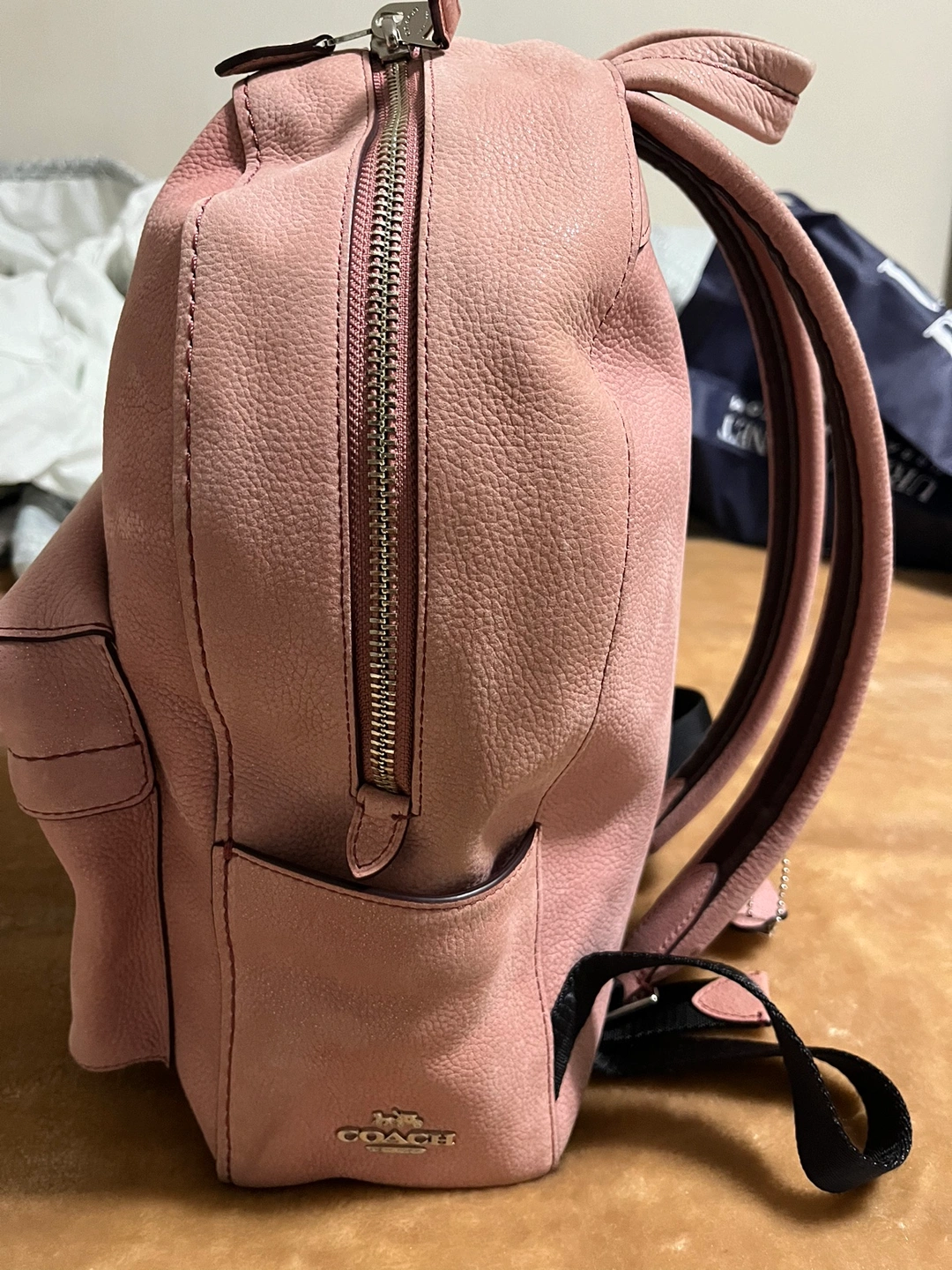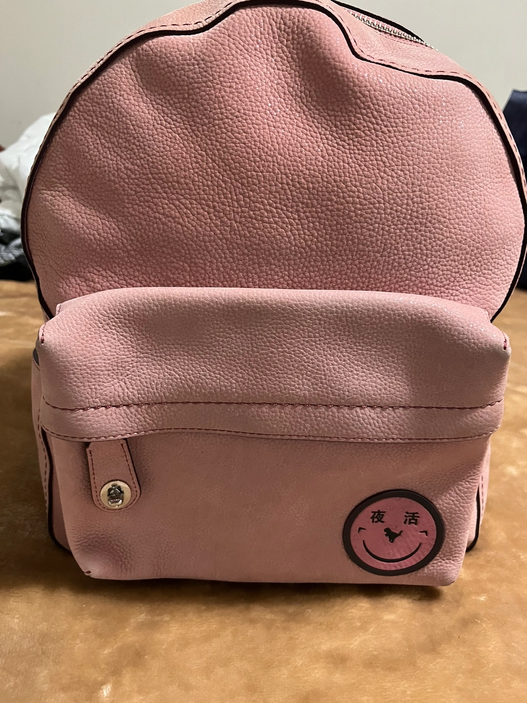 This is a Coach backpack. It is pink in colour and features a patch on the front (the patch is from a collab but it could be carefully removed if wanted). It has a zipper closure. It has two adjustable straps. There is a small pocket inside the backpack. The backpack has a Coach logo of authenticity. Can’t say it is new because I don’t have the bag it came in but it is been used 1 or 2 times