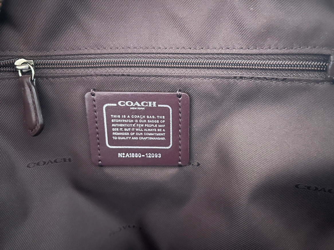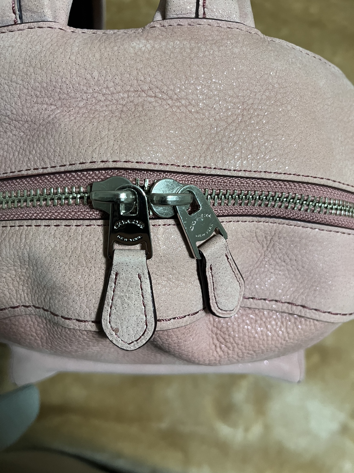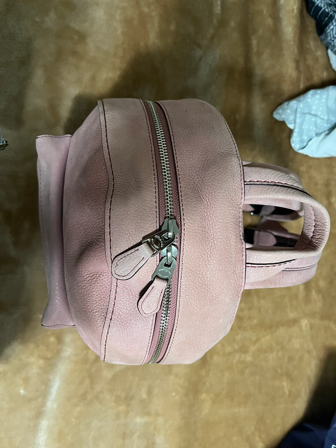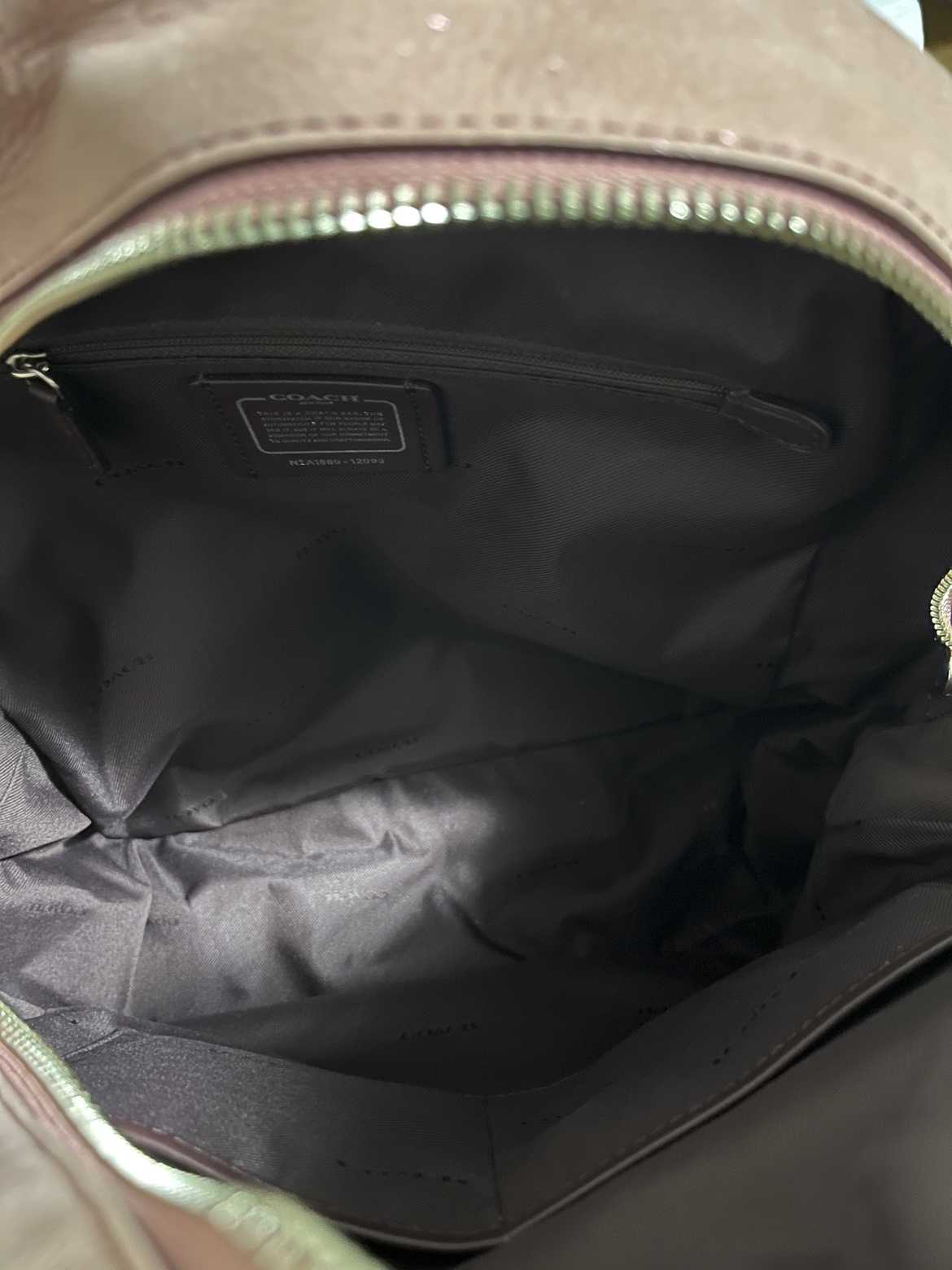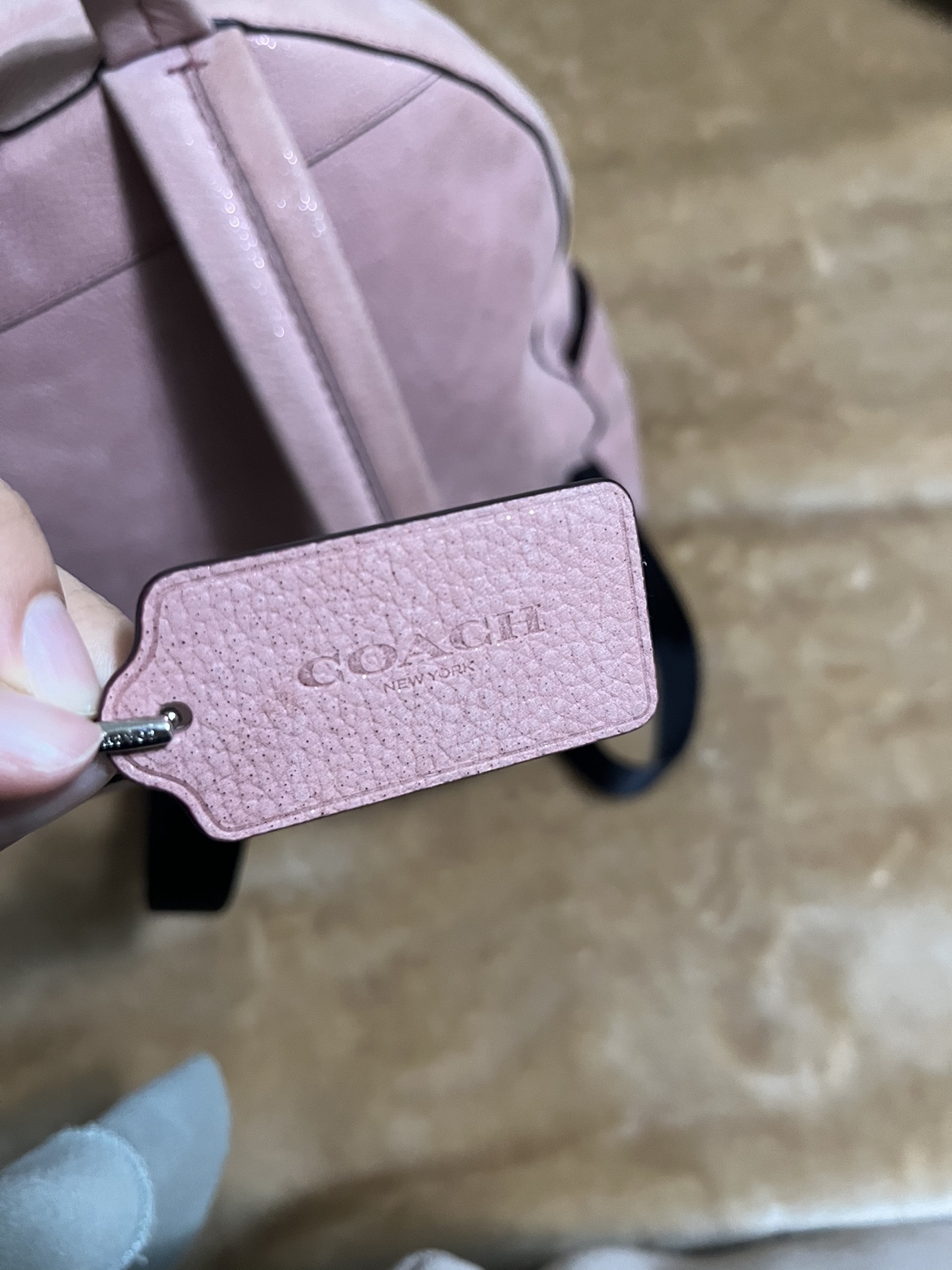 This is a Coach backpack. It is pink in colour and features a patch on the front (the patch is from a collab but it could be carefully removed if wanted). It has a zipper closure. It has two adjustable straps. There is a small pocket inside the backpack. The backpack has a Coach logo of authenticity. Can’t say it is new because I don’t have the bag it came in but it is been used 1 or 2 times