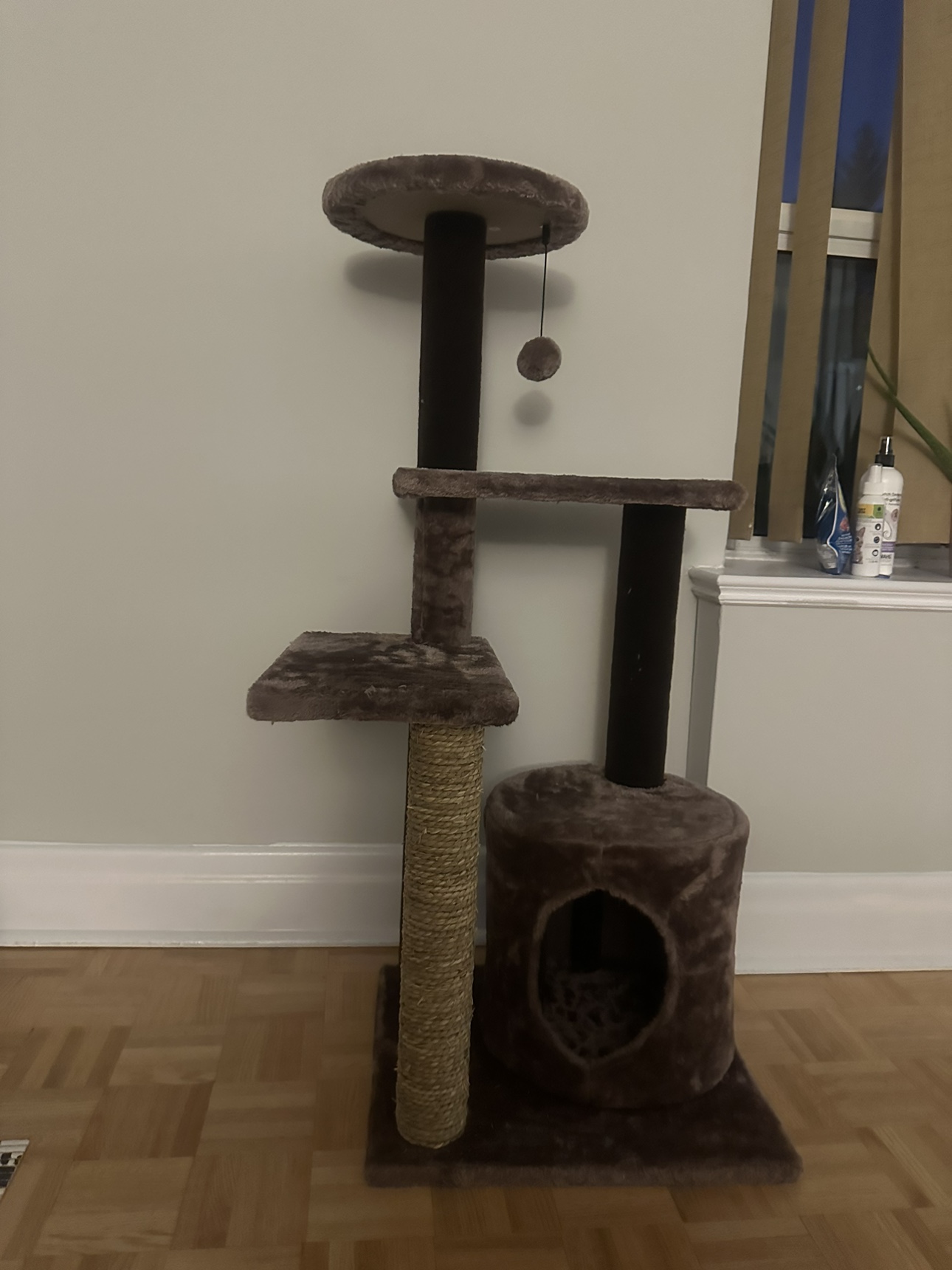 Brown cat tree with multiple platforms, a scratching post, and a hideaway. It also comes with a dangling toy. Never been used our cat it’s to big for it.