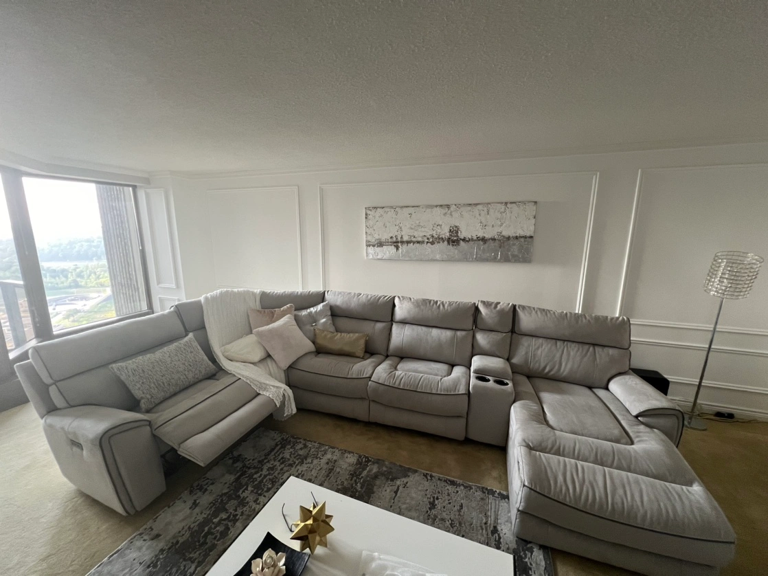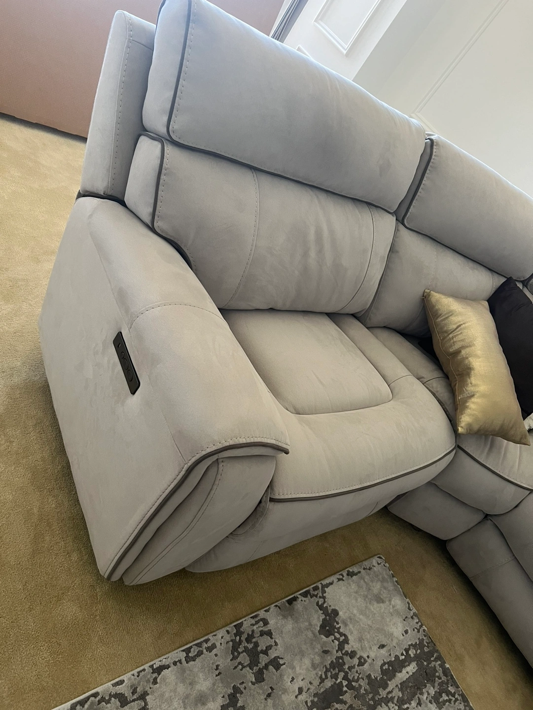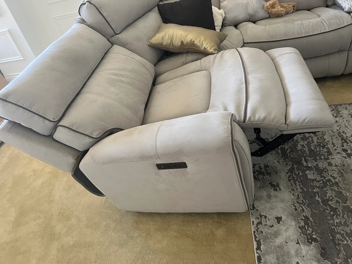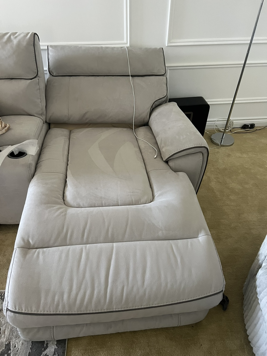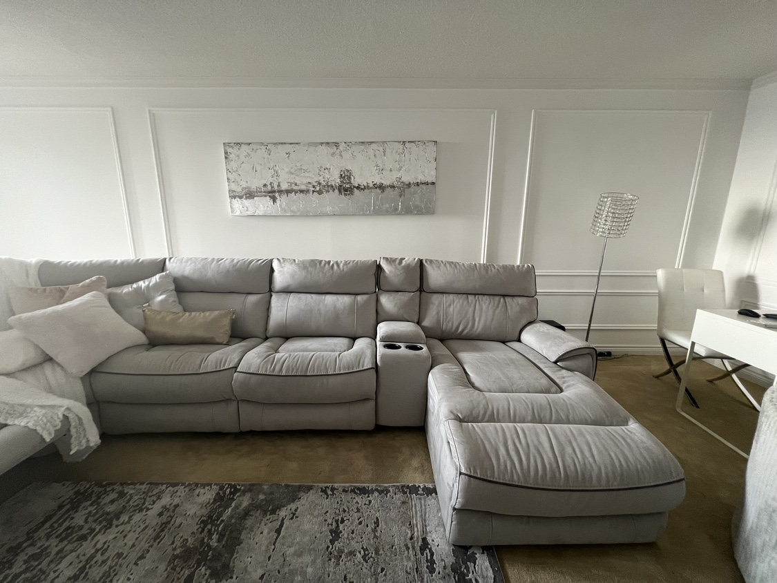 Large grey sectional sofa with reclining seats and a pull-out footrest on the chaise. There are two cupholders in the middle section. The sofa is very comfortable and perfect for a large family.