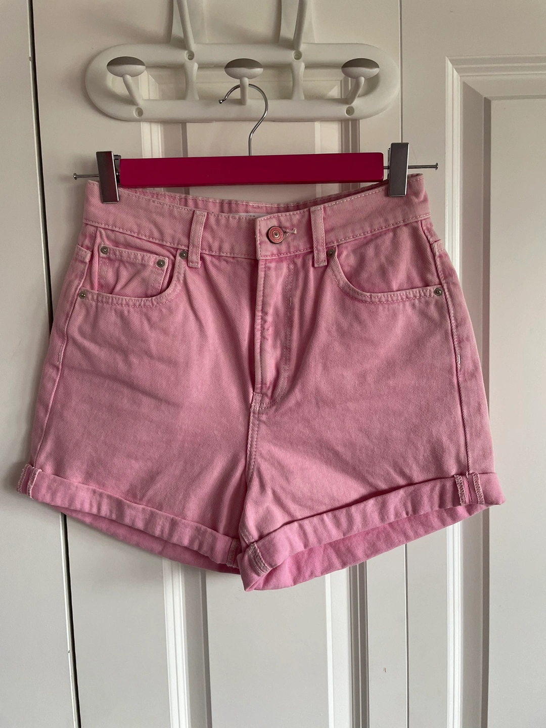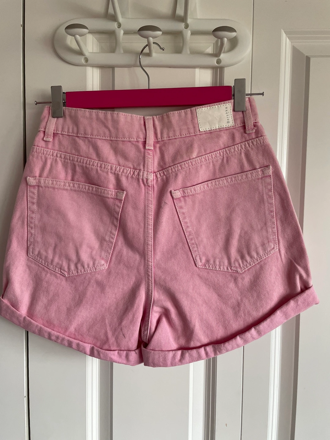 High-rise, cuffed denim shorts from Bershka in a pale pink colour.