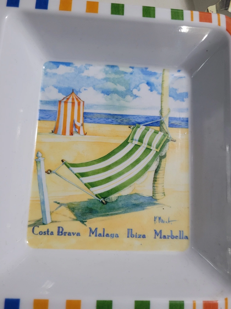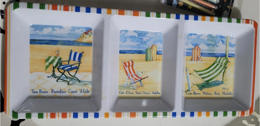 A three-section serving tray with a beach theme. Each section has an image of a beach and a beach chair. The tray has a striped border in orange, green, red, blue, yellow and white.