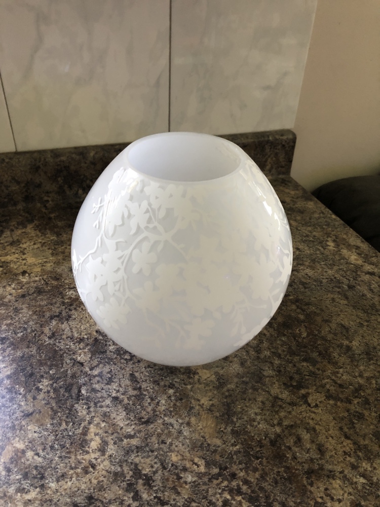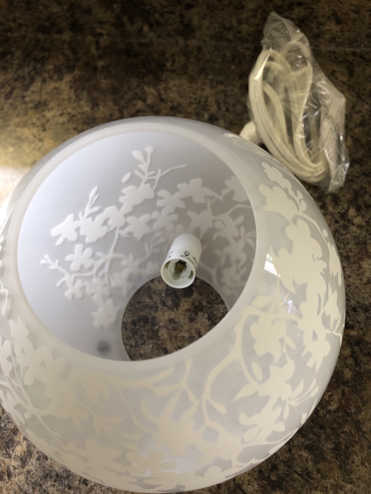 A white glass table lamp with a floral cherry blossom design. It comes with a cord and plug.