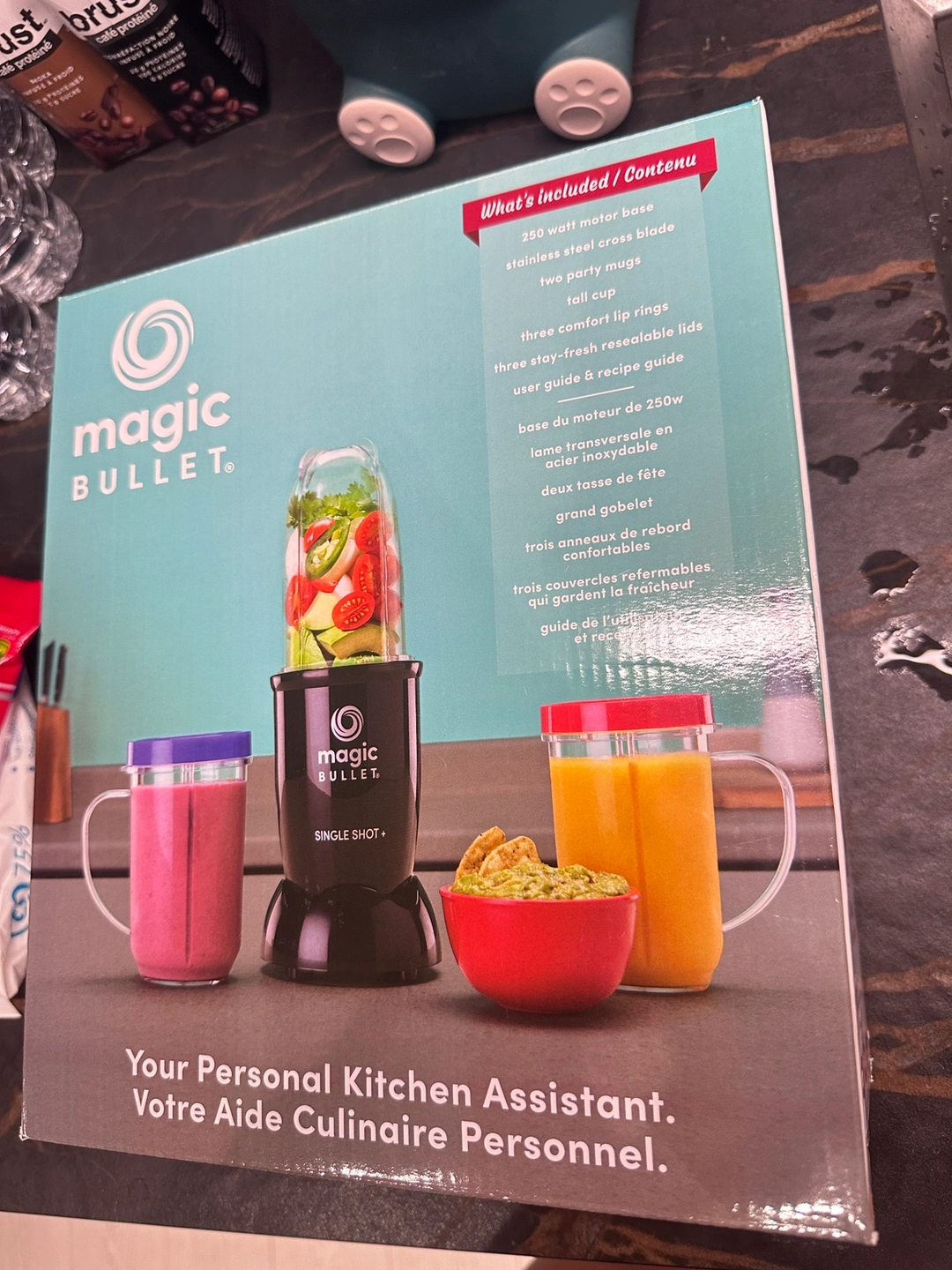 The Magic Bullet blender is the countertop helper that chops, blends, and mixes to create an endless array of delectable dishes in seconds. It's a 250 W compact single serve blender perfect for small spaces. Simple and intuitive just push and blend. Cross blade is made from stainless steel and cups are super durable plastic. Includes: (1) 250W Motor Base, (1) Cross Blade, (1) Tall Cup, (1) To Go Lid .