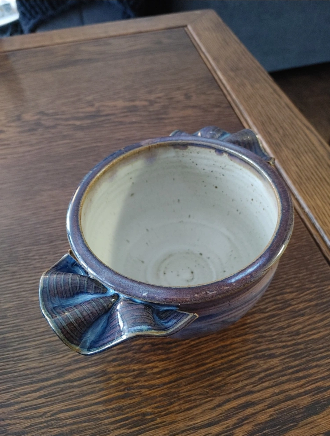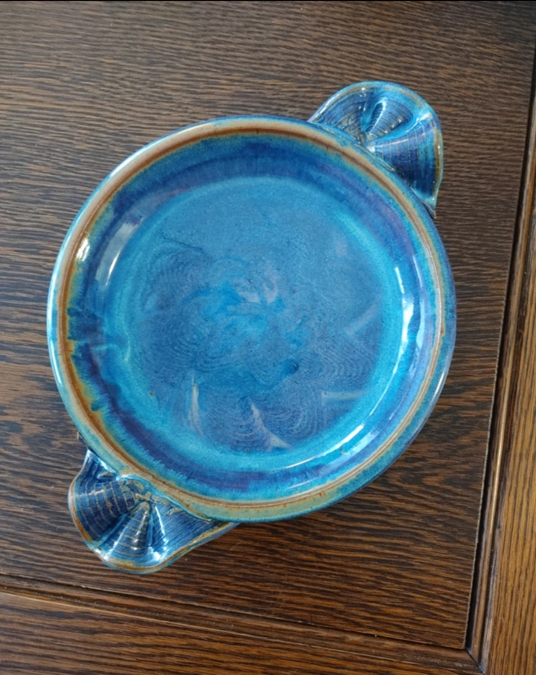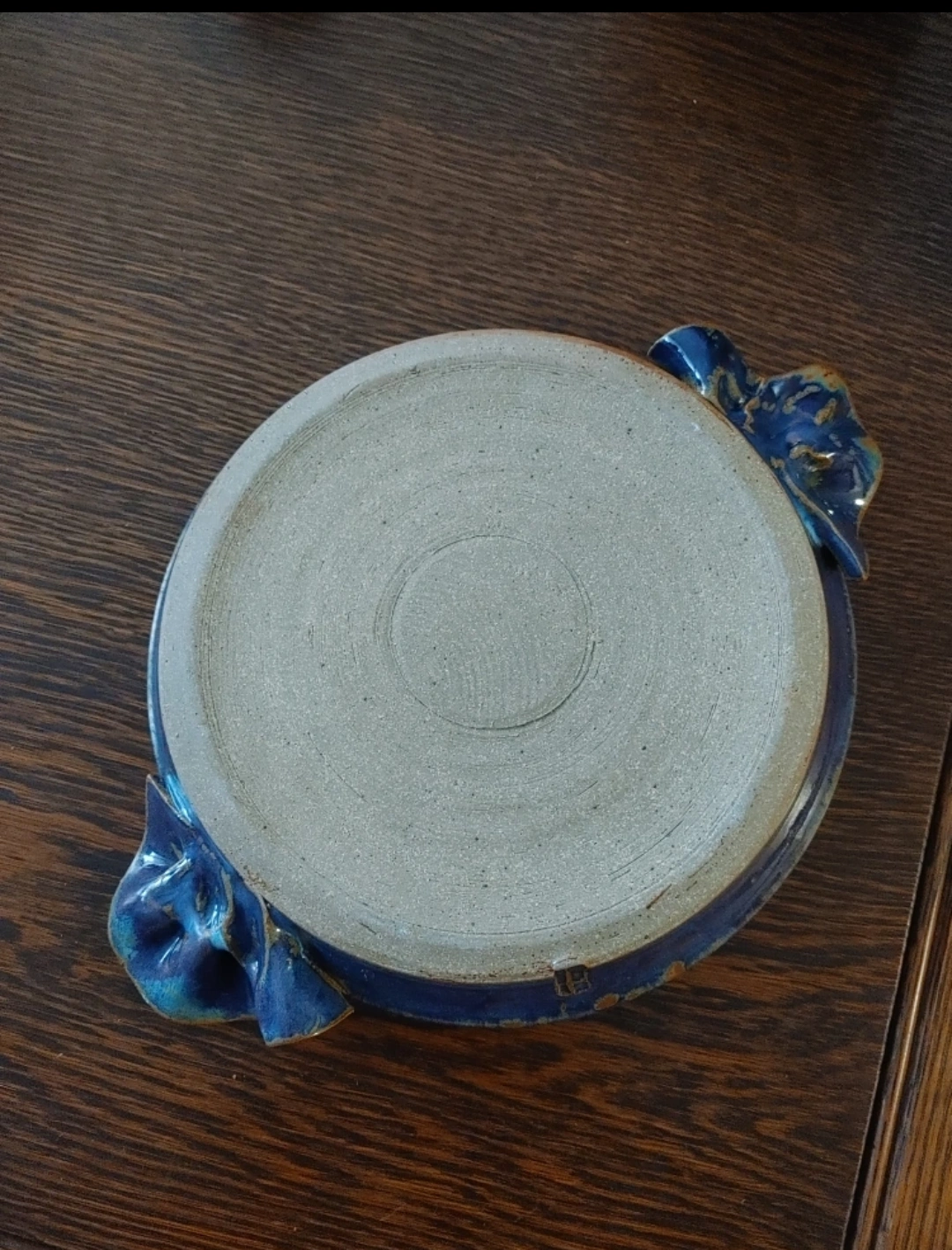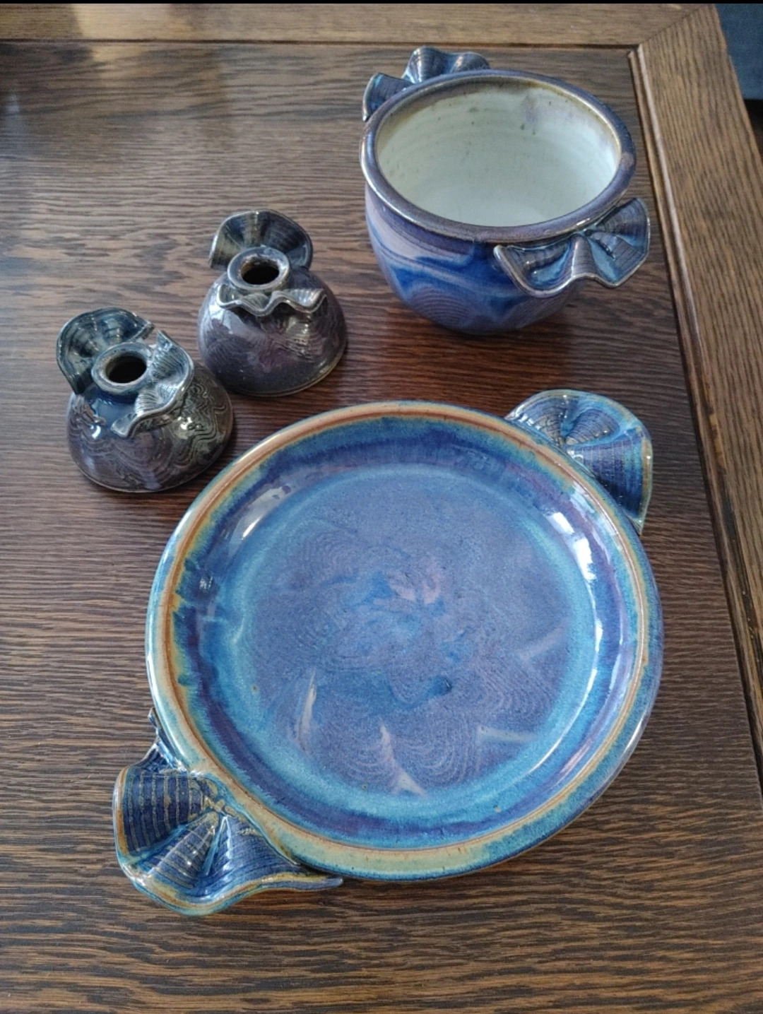 300Set includes a small bowl, two candle holders, and a round platter. All pieces are handmade from clay and are glazed with a blue and purple design.