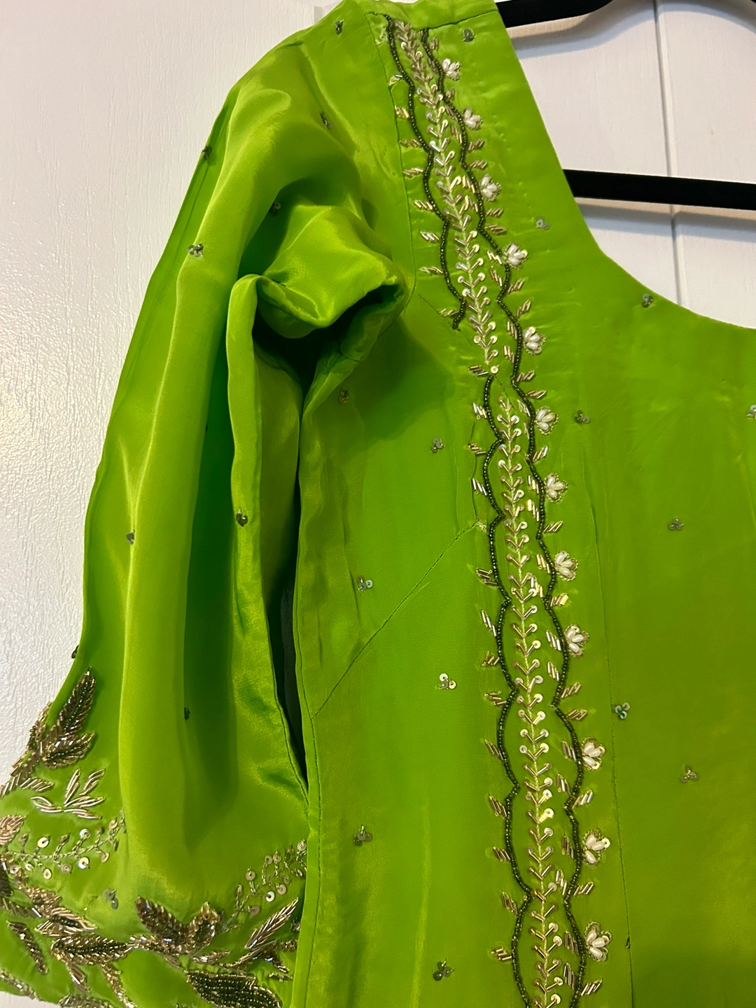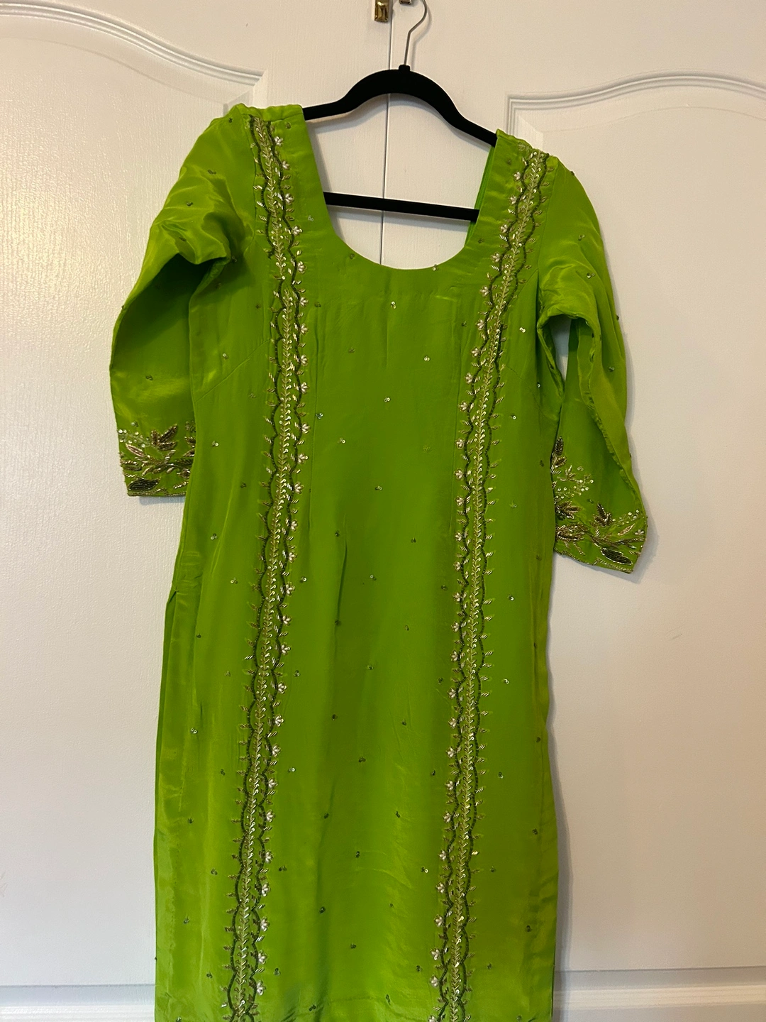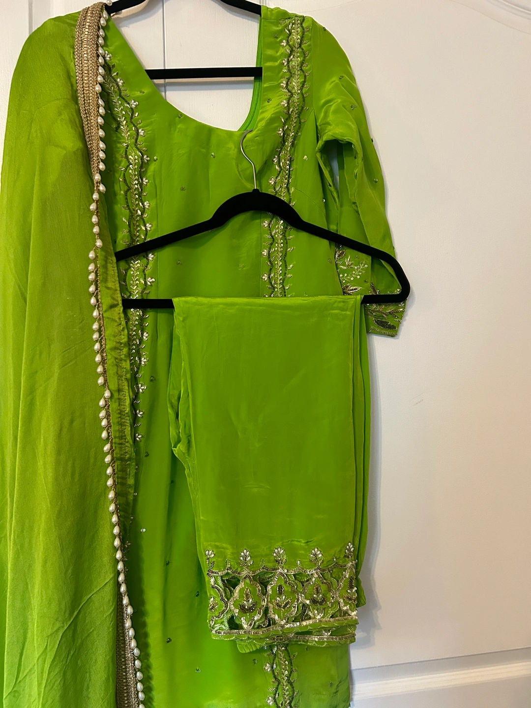 Beautiful mehendi green suit with gold and silver embellishments.